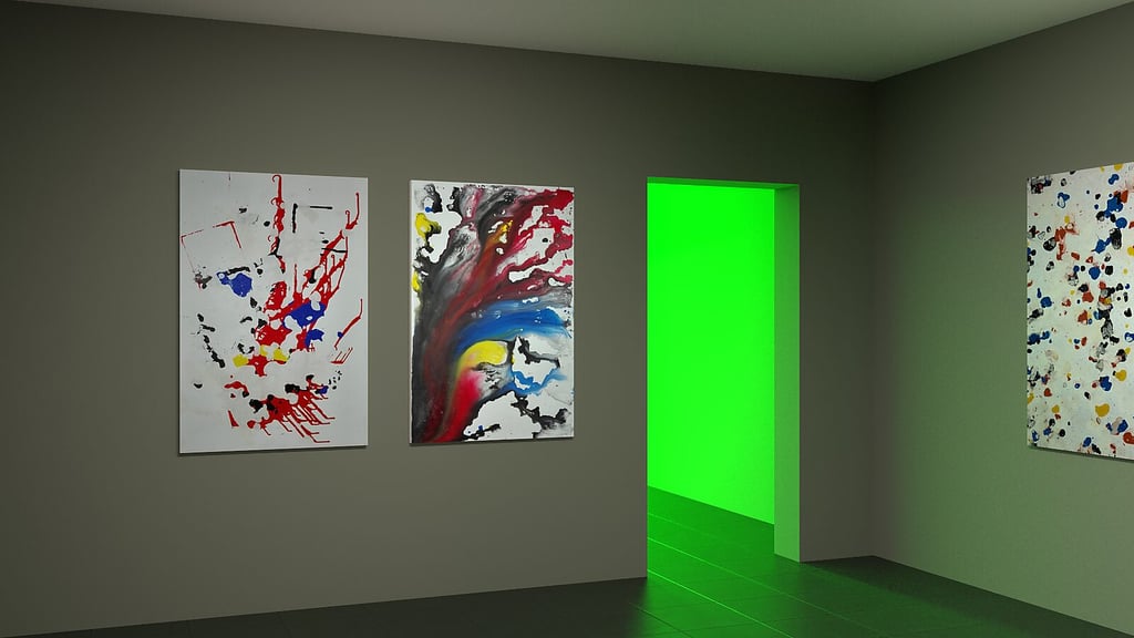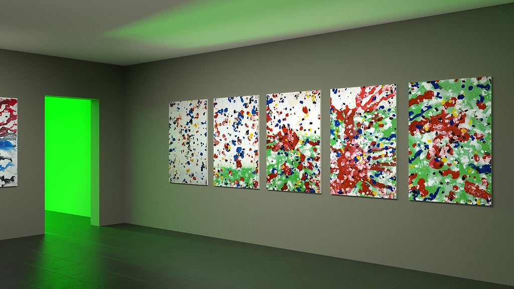 For the presentation of the Mondrian works, I devised an exhibition concept in which the paintings are shown alongside process videos. The television screens are exactly the same size as the paintings. In the video, a single tree appears, but the idea is that visitors must first pass through — or, metaphorically, look through — a fragment of nature in order to view the works.