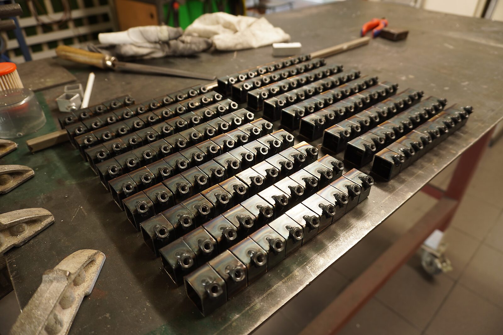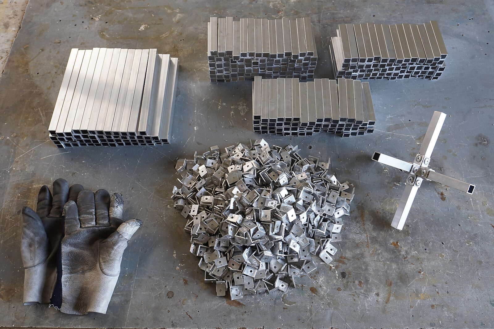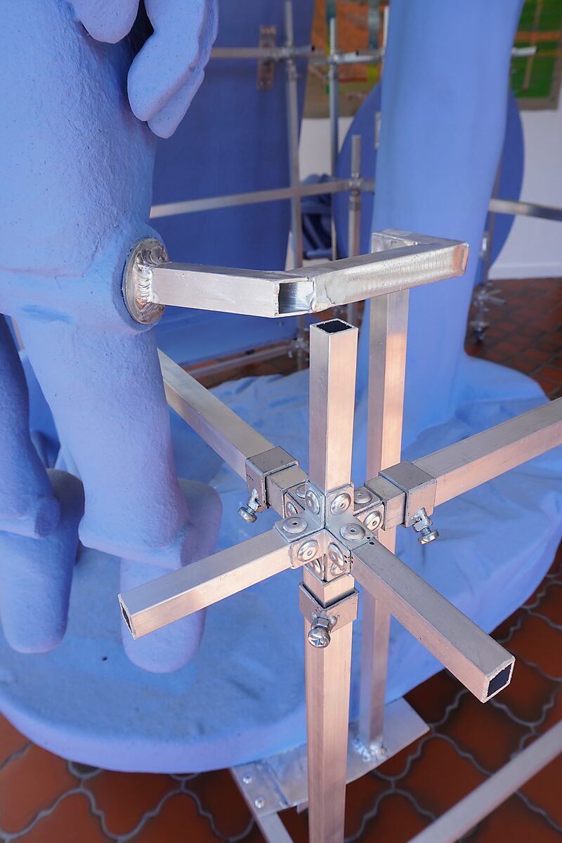 The connecting pieces — originally L-, T-, or multi-directional — were disassembled and reassembled using stronger rivets and adhesive into a cross-shaped structure opening in all directions.