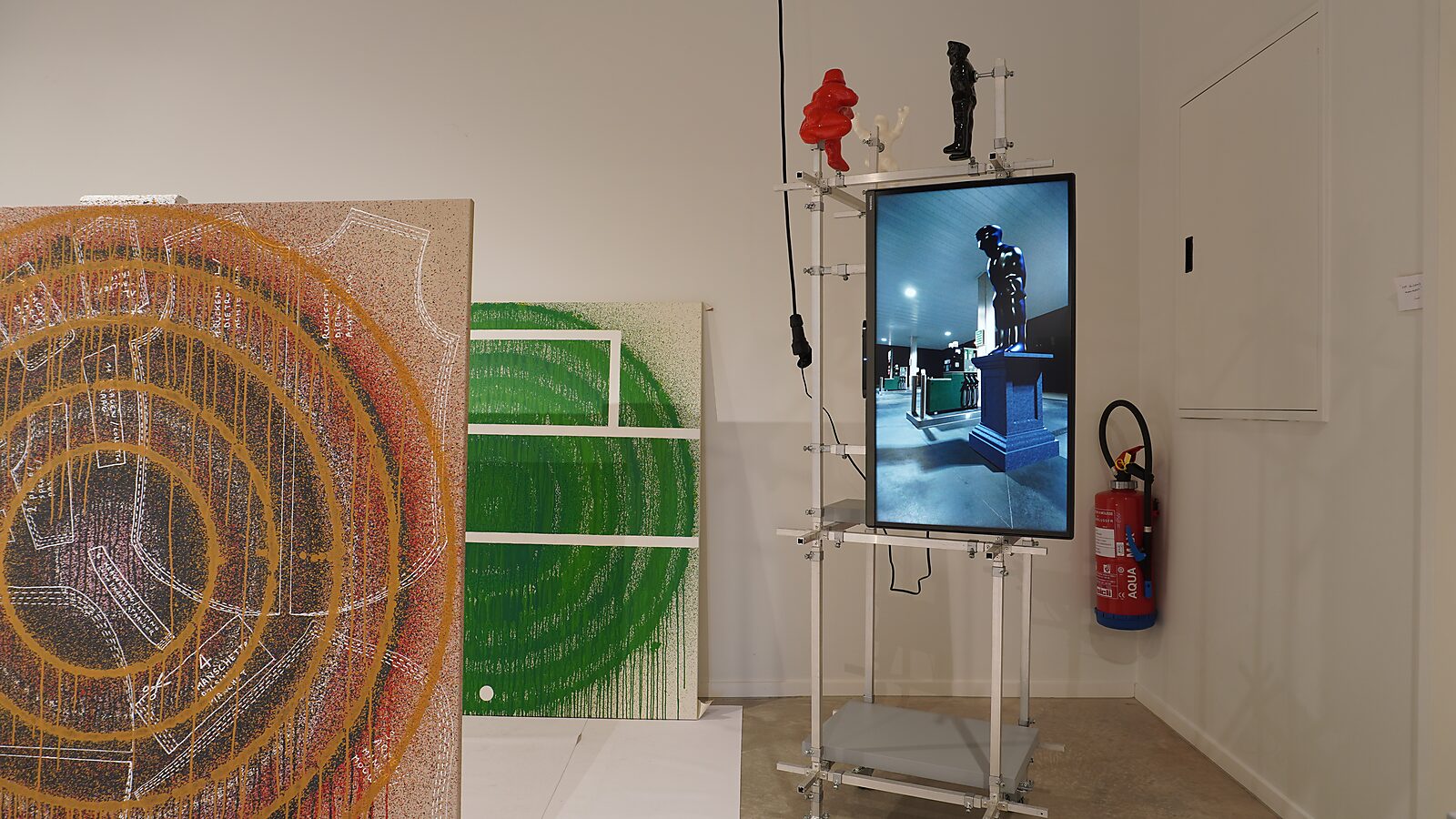 The installation contains all the shapes featured in the video. Through shifting light effects, the shadow of a UFO moves constantly across the space, creating the illusion of motion.