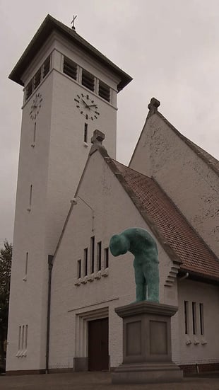 In this video, a figure inside a church tries to catch a flying cross with a fishing net.