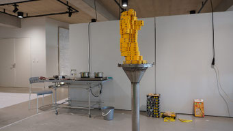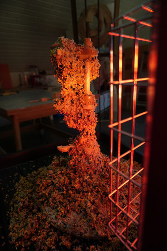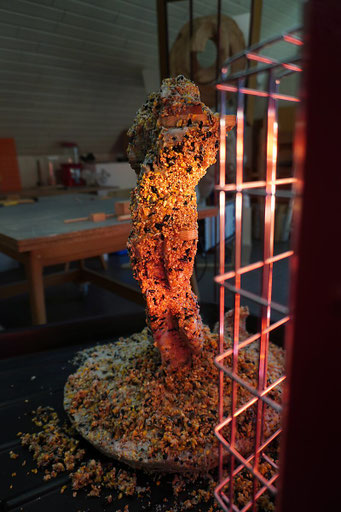Het beeld, deze keer opgebouwd uit rundsvet en glaskorrels, wordt door een infraroodstraler verwarmd en begint langzaam te smelten en te vervormen. De glaskorrels zakken naar beneden, het lichaam verliest zijn samenhang.
