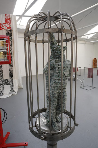 In dit performatieve kunstwerk hergebruik ik de mal uit het project Sint-Sebastiaan met vogels nr. 2 en plaats ik Sint-Sebastiaan — zonder pijlen in zijn lichaam — in een inox kooi.