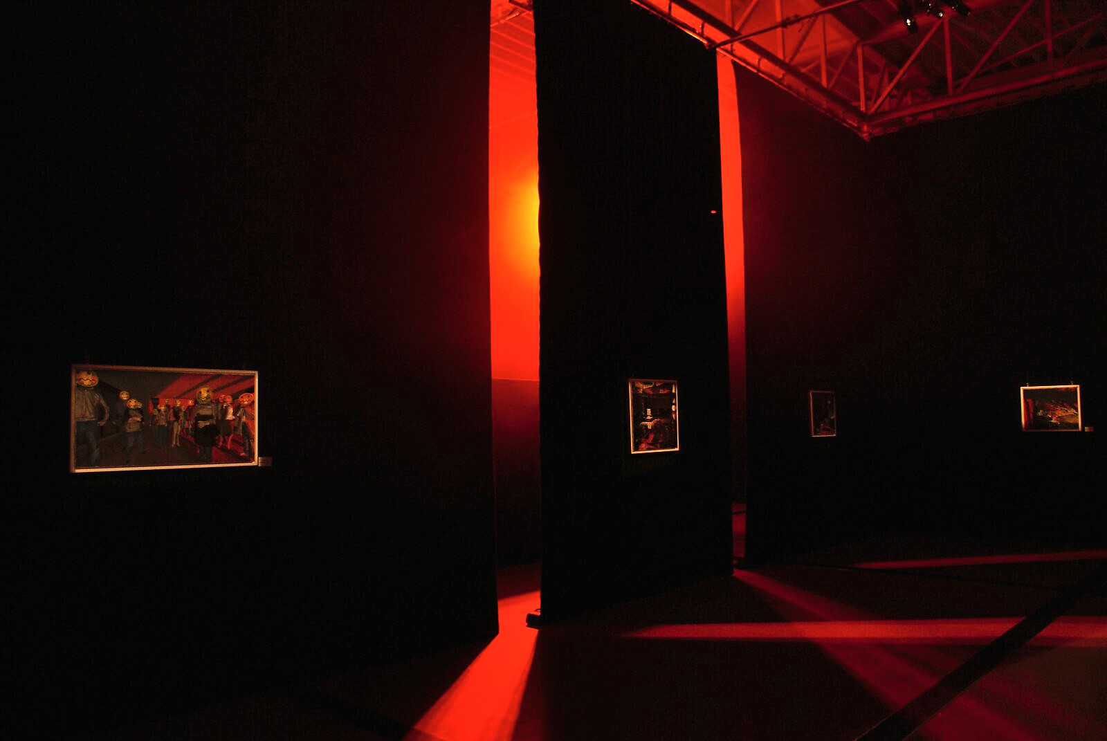 De negen geschilderde werken hingen in een verduisterde zaal die de bezoeker omsloot als een grot.