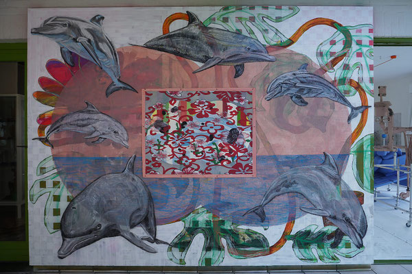In a next phase, I glue older drawings onto the panel, causing them to lose their independence while merging into a new whole. Paintings, on the other hand, are attached only temporarily, allowing me to explore new compositions without erasing them permanently. In this way, the panel grows into a place where the past and present of my work flow into one another.