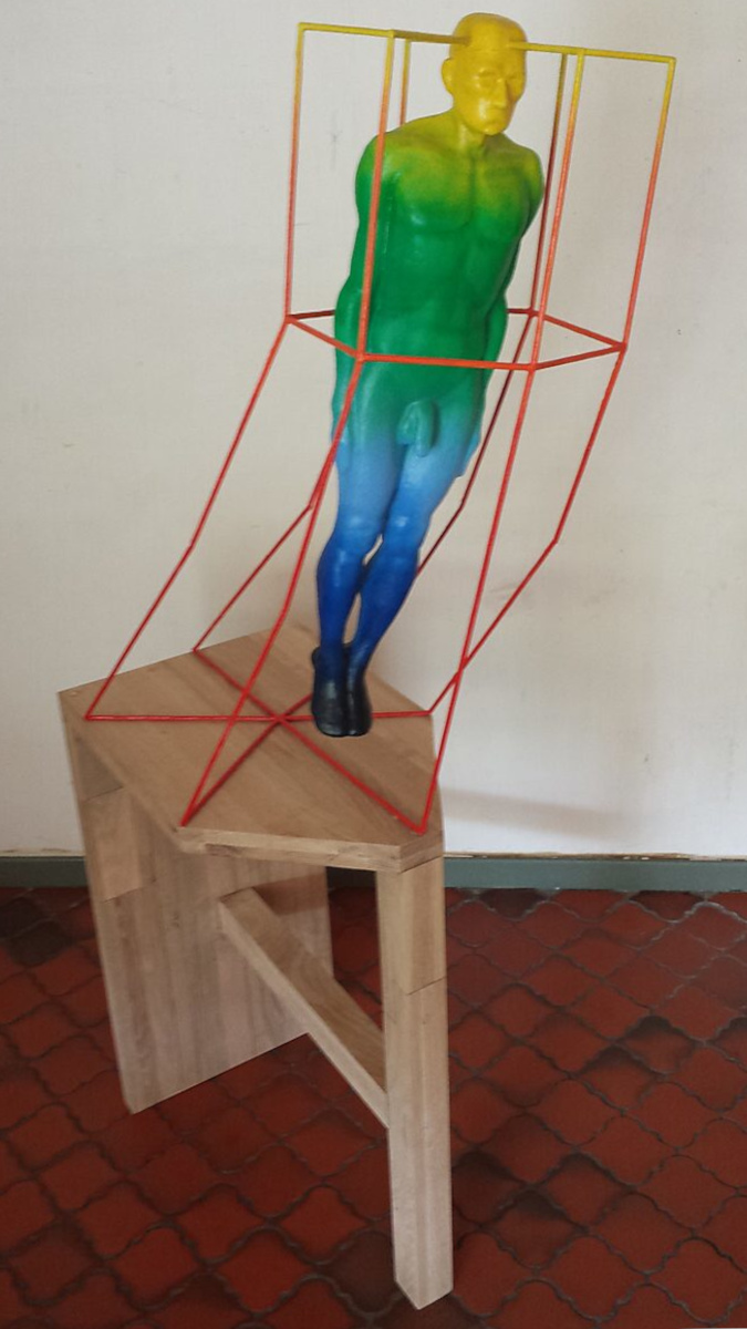 In Gedachtenkooi zie je een hangende figuur, gevangen in een eigen constructie van gedachten. De intense kleuren zijn gebaseerd op warmtecamera’s: blauw voor koude, rood voor energie en verbruik.