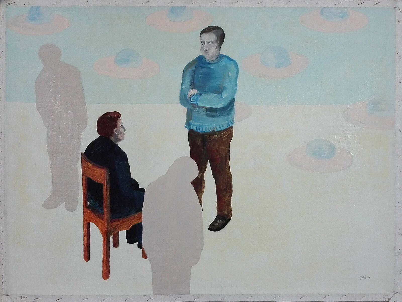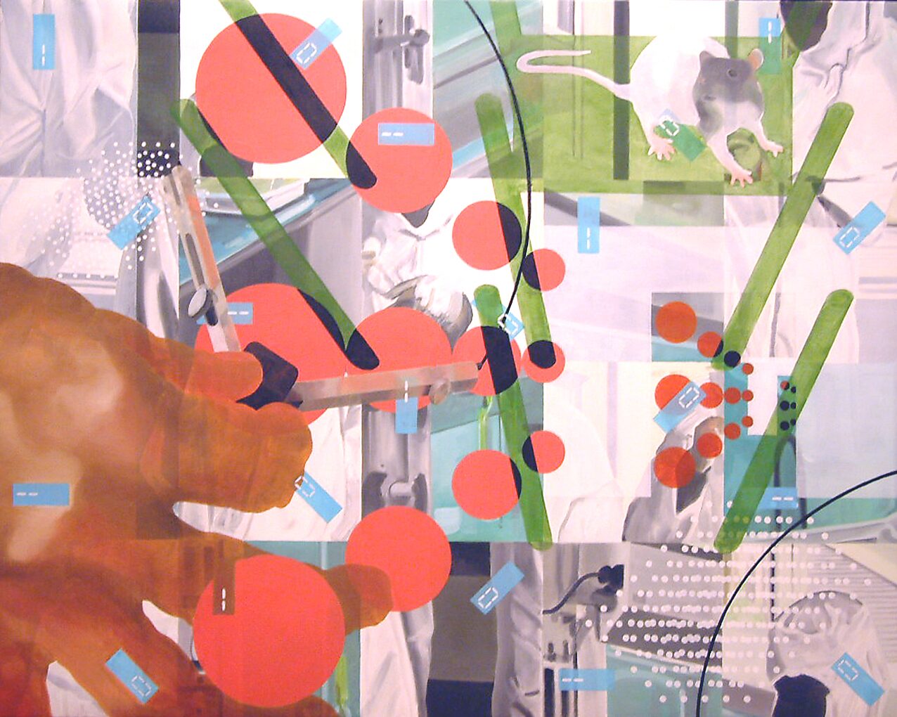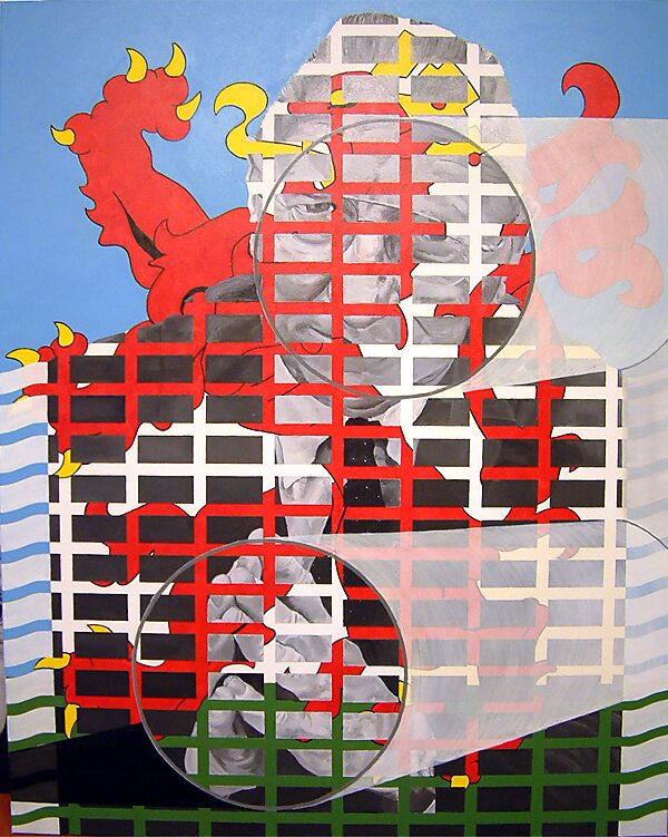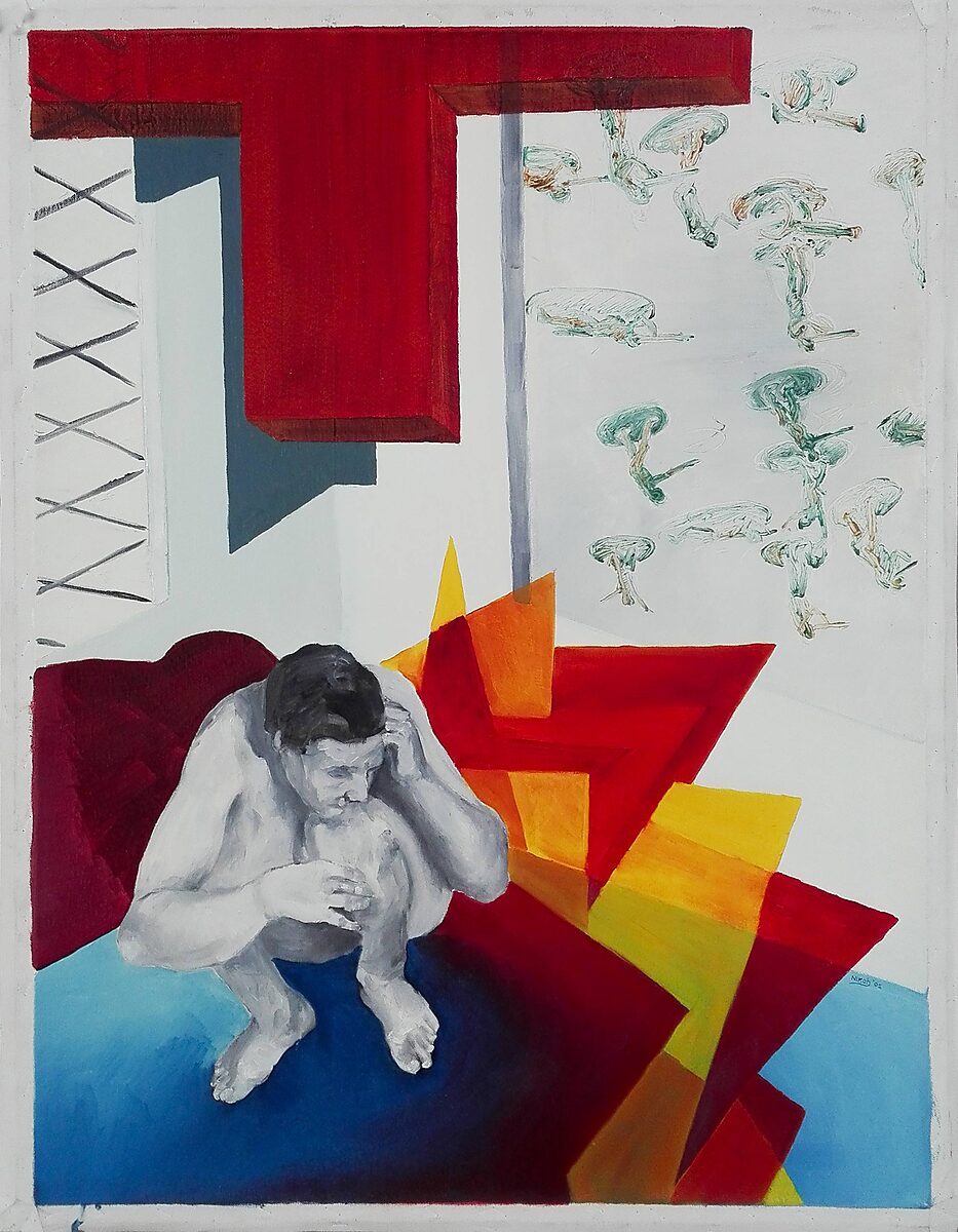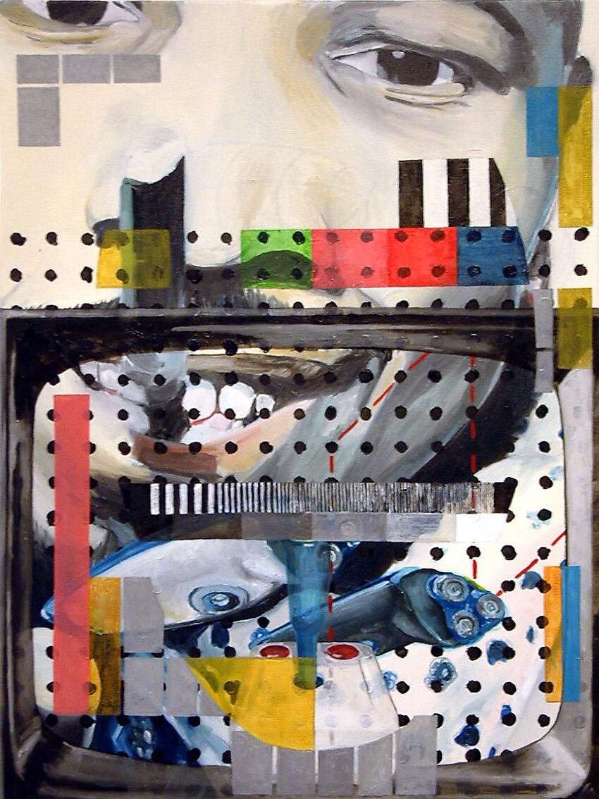 De veelheid aan informatie in onze samenleving vormt voor mij het vertrekpunt in deze reeks. Ik werk in lagen: na elke schilderlaag leg ik het beeld digitaal vast en bewerk het verder, zodat compositorische beslissingen kunnen worden verfijnd en geaccentueerd. Deze methode bouwt voort op mijn eerdere experimenten met gemengde technieken, maar hier beschouw ik de digitale bewerking als een volwaardig onderdeel van het schilderproces. Transparantie en opbouw laten het gelaagde ontstaan van het werk zichtbaar aanwezig blijven.