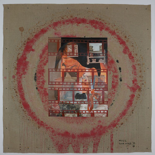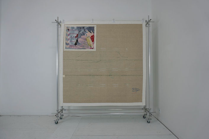 Op de achterkant van het doek ‘MT.4.5. Naaipatroon voor Bruinhemden’, uit het project Smeltende doelen, heb ik het olieverfschilderij ‘Cutting History’ (2003) uit deze reeks vastgenaaid.