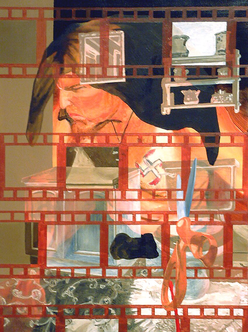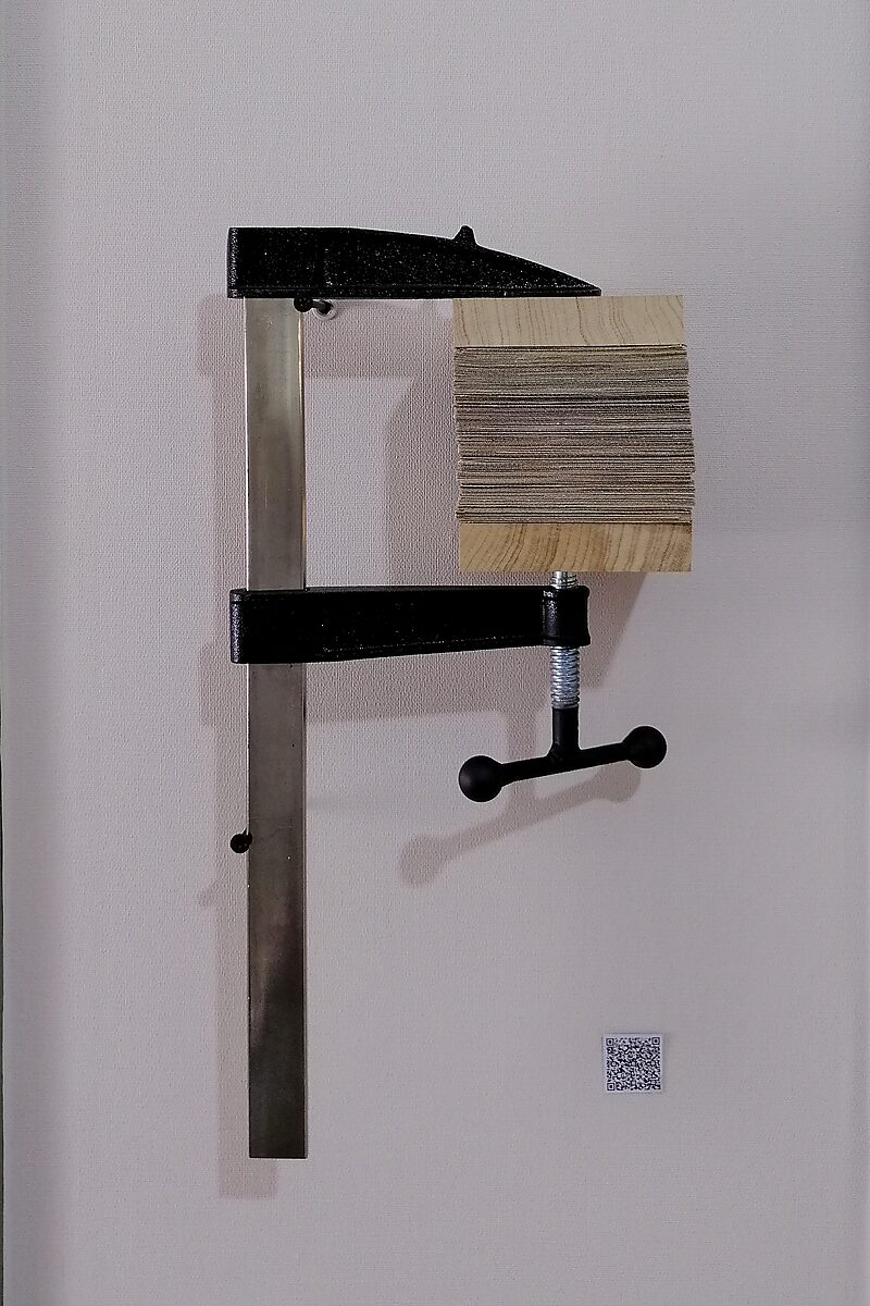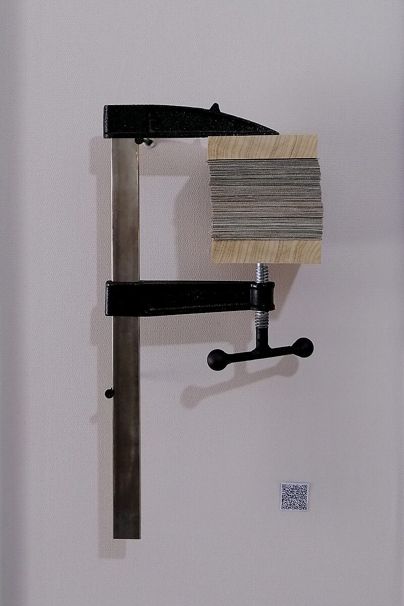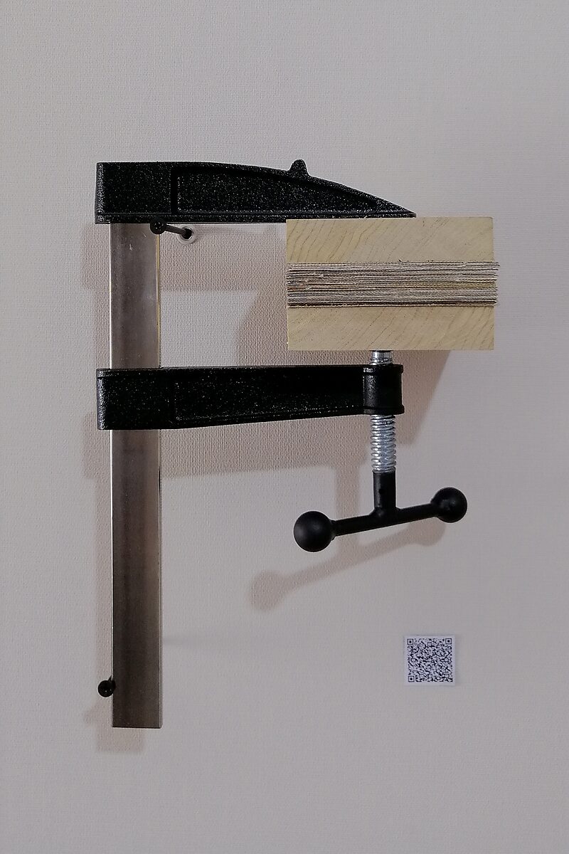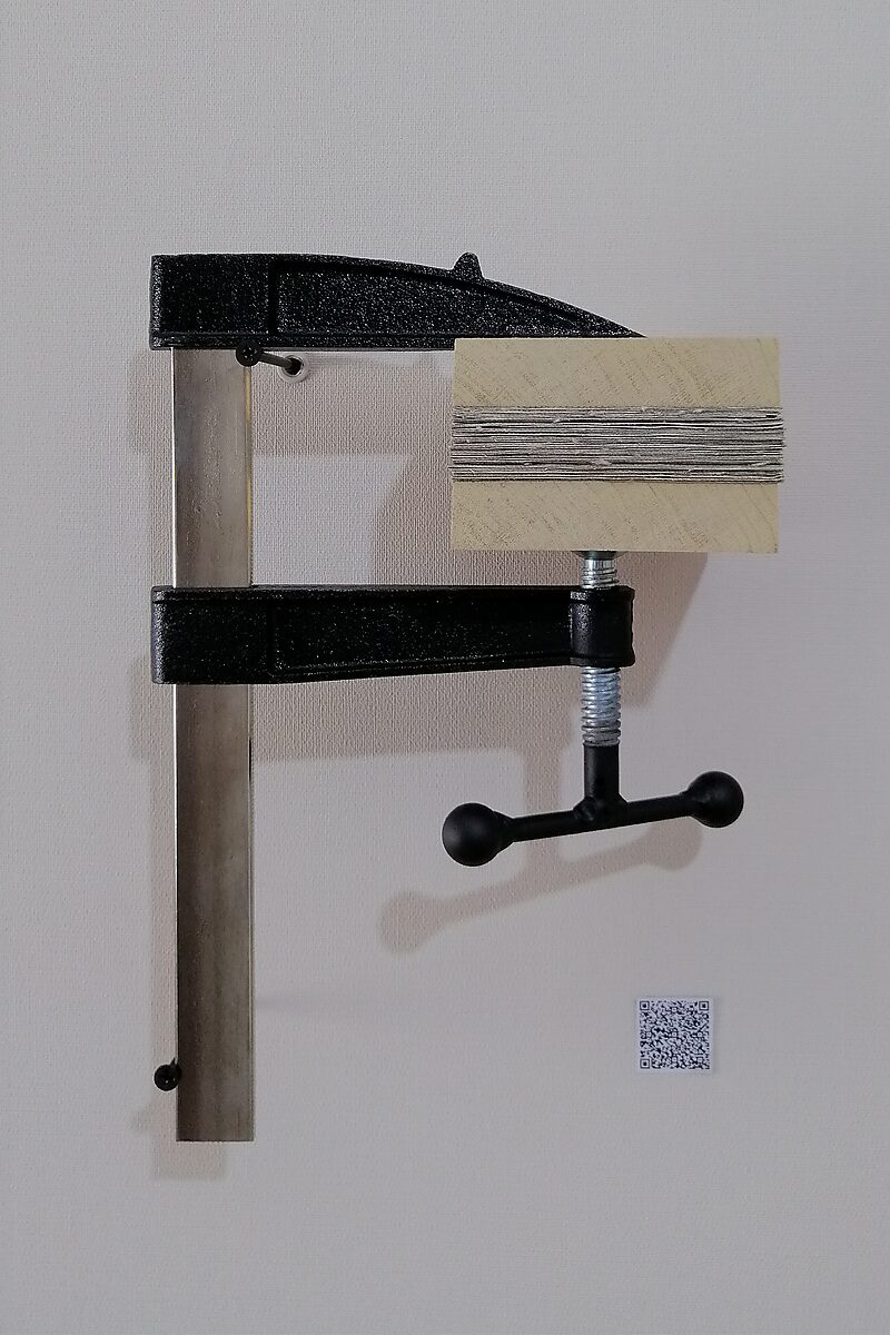 Het schilderij kan alleen opnieuw bekeken worden door de klem los te maken en de fragmenten te reconstrueren. Die handeling verandert het werk van spanning en geslotenheid naar openheid en ruimte — een omkering van de digitale compressie, waarin het oorspronkelijke weer tijdelijk tot leven komt.