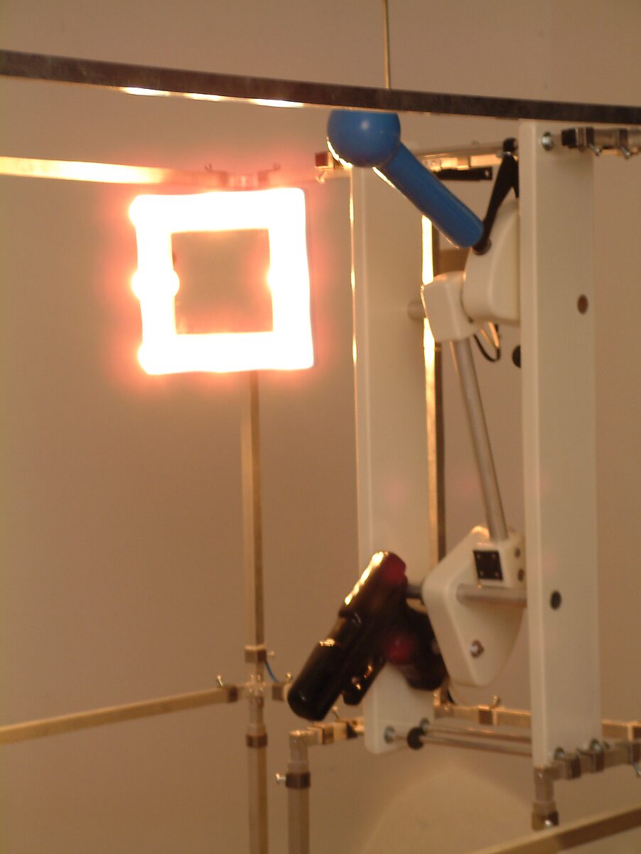 Wanneer de hendel wordt overgehaald, komt een pistool in schietpositie. De actie wordt live gefilmd en getoond op een LCD-scherm, zichtbaar voor het publiek.