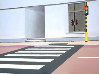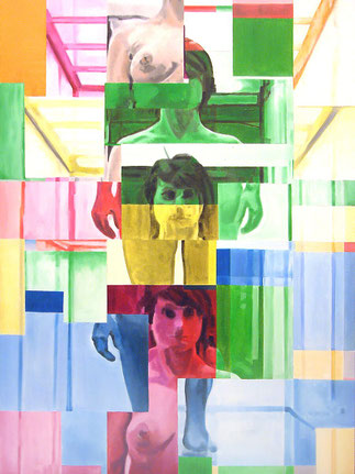 I created two versions: a painting and a spatial piece. On the canvas, the viewer sees an elevator descending, represented by colorful, moving horizontal and vertical bands. The painted fragments are stills from the video. Each time a frame from the film passes over its corresponding painted section, the colors subtly light up.