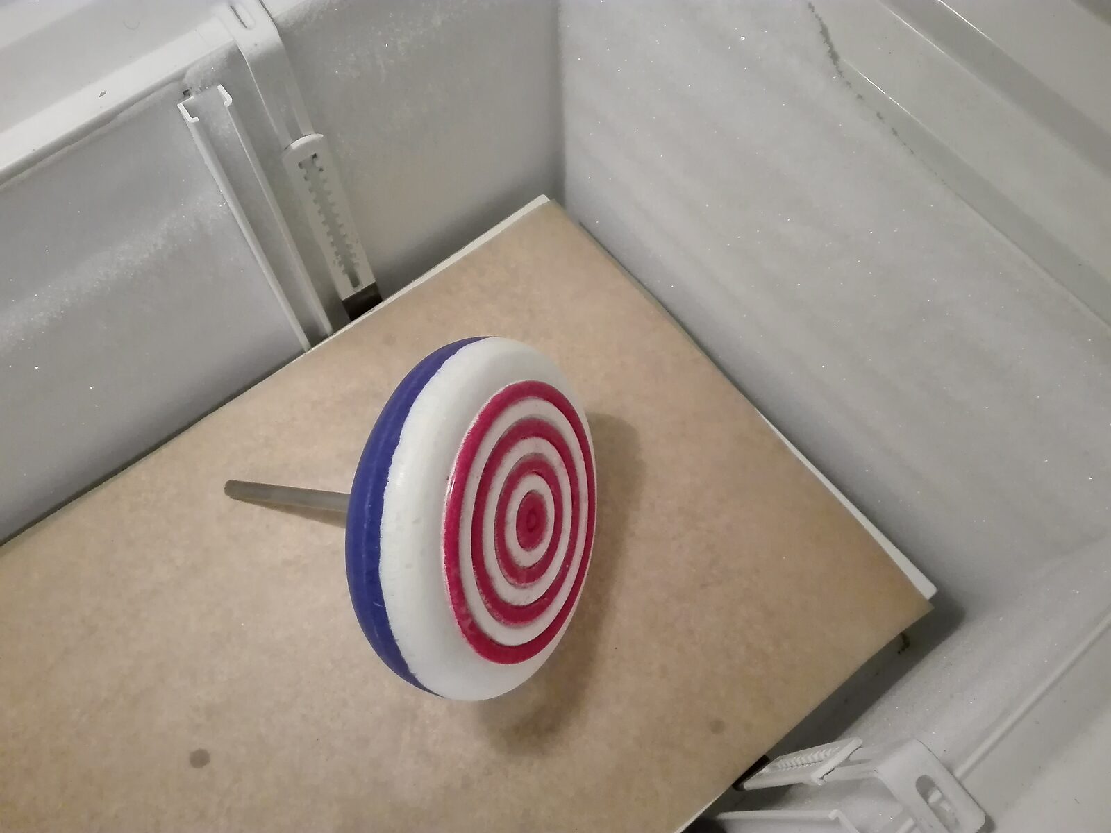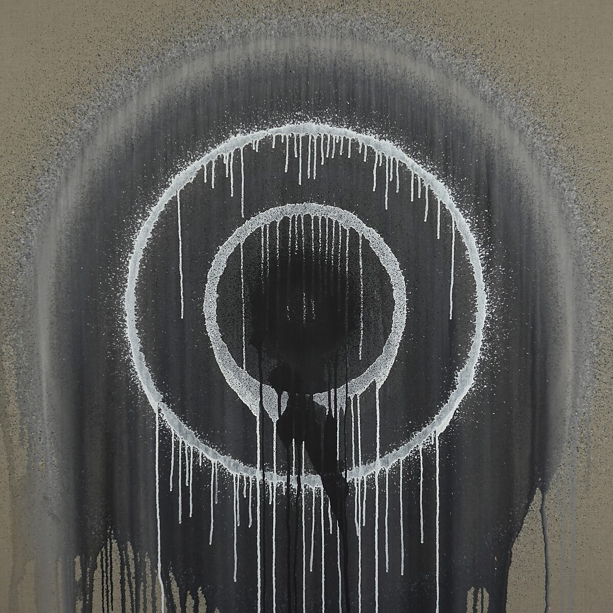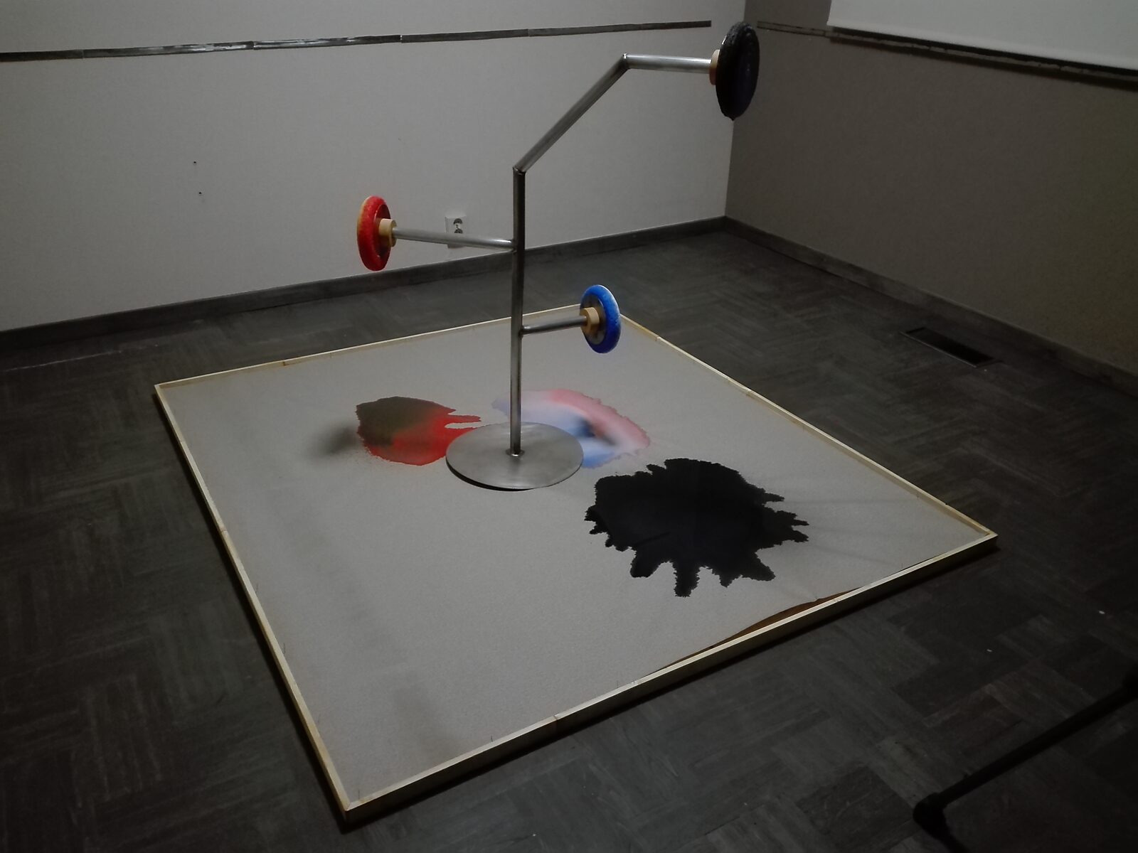 Melting Targets no. 3 evolved from the first two versions. Instead of placing a metal stand on the canvas, I attached the ice discs to a rotating metal structure suspended above it. As the discs melt and spin, they drip and form a new, larger target on the canvas.
