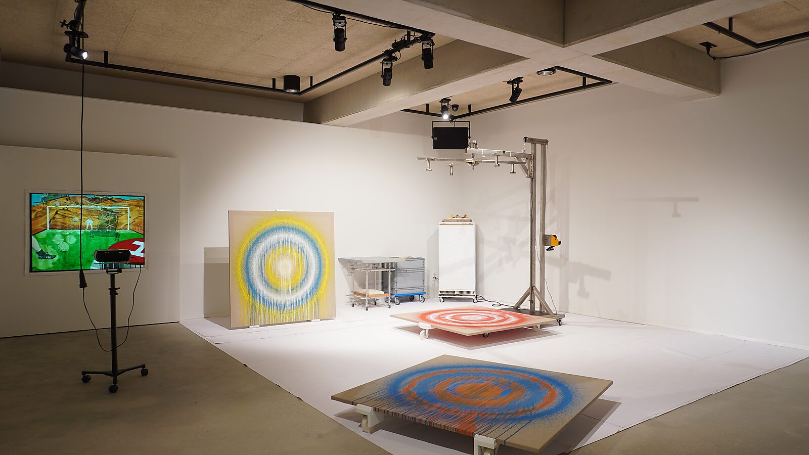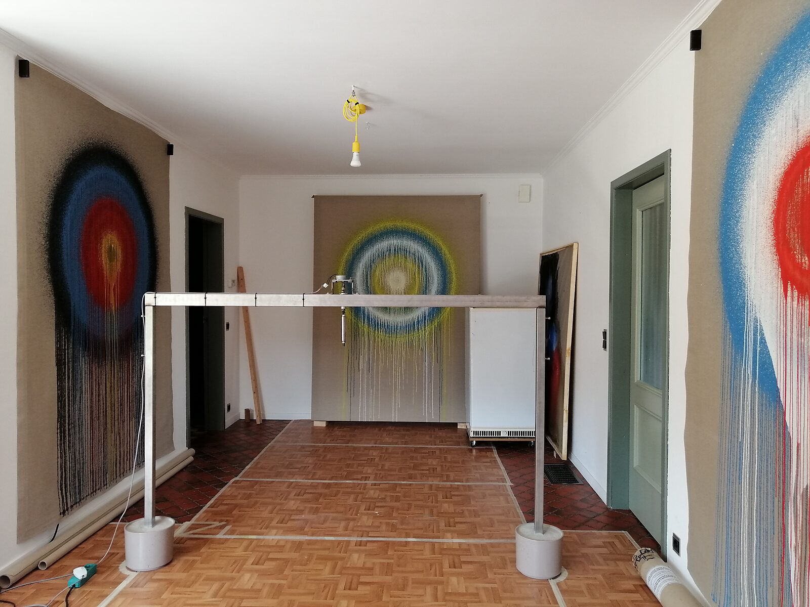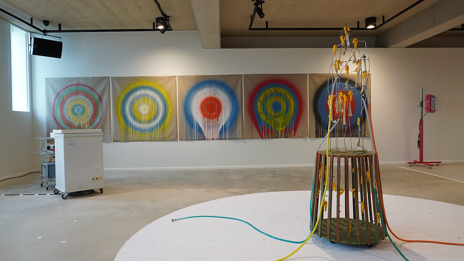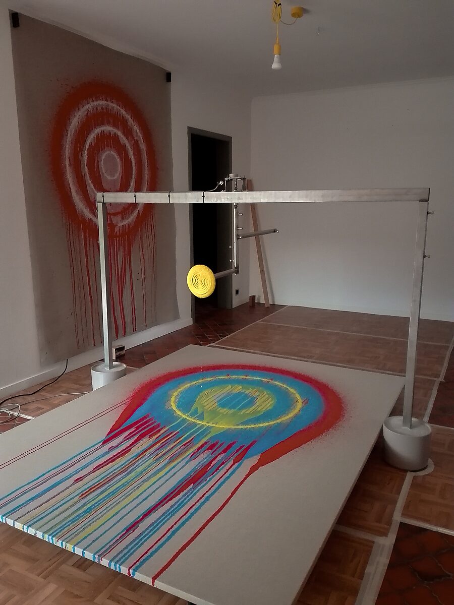 The setup allows for great variation: the thickness of the paint, the tilt of the canvas, the order in which the discs melt, or the height of the targets can all be adjusted. When the installation is active during an exhibition, the painting process can be experienced live.