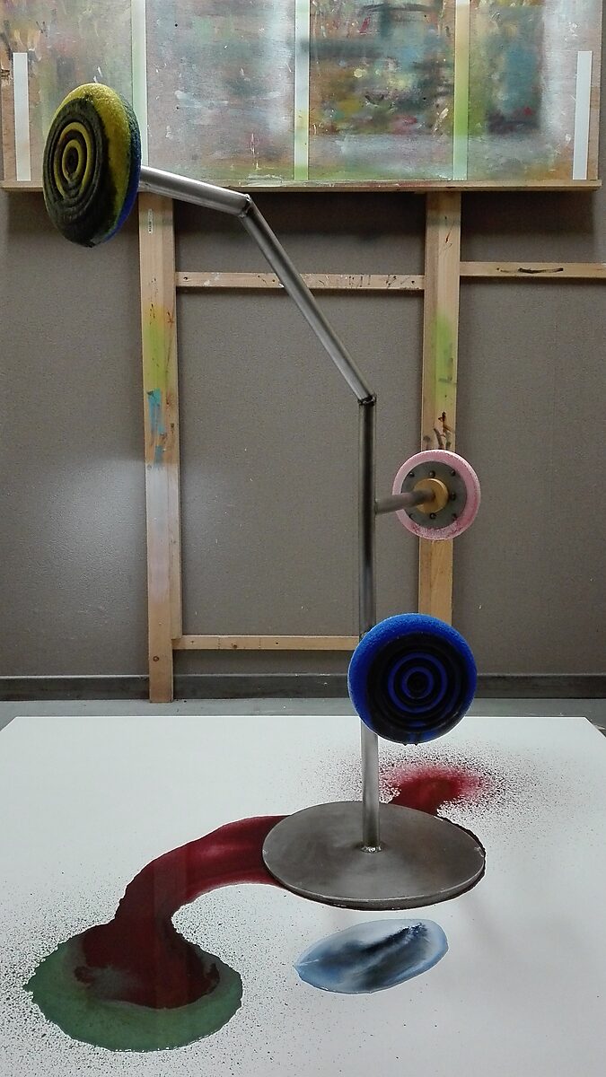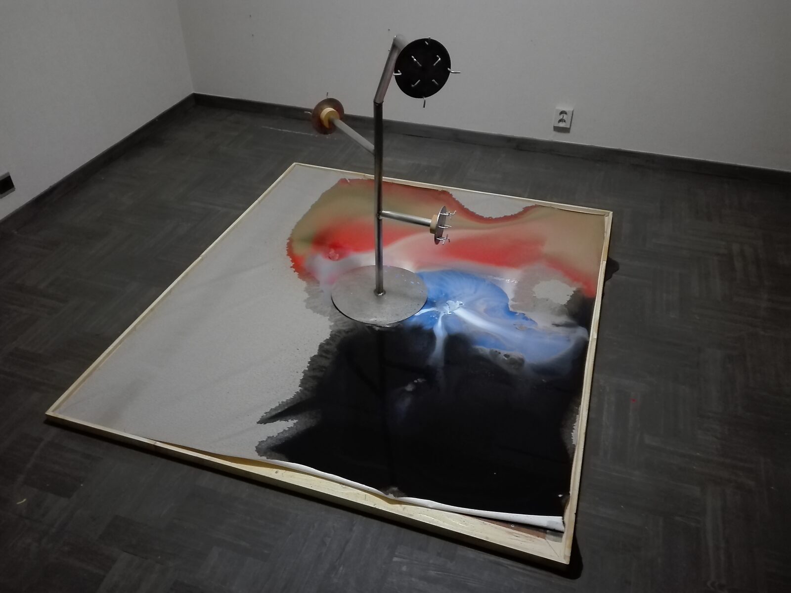 This installation unites several domains: it generates paintings, incorporates a technical-constructive component, and involves a physical transformation of matter — ice becomes water, and water dries into traces of paint.