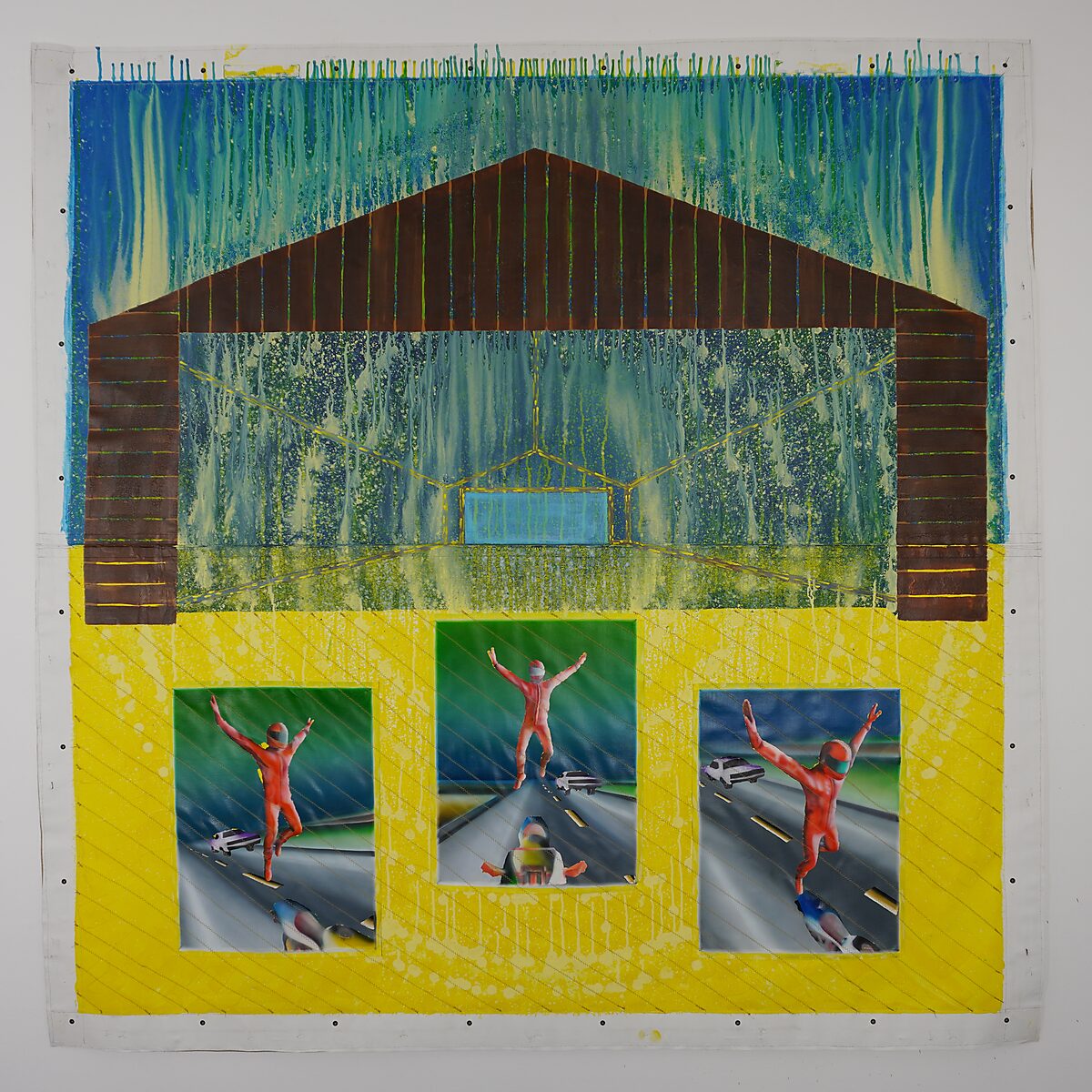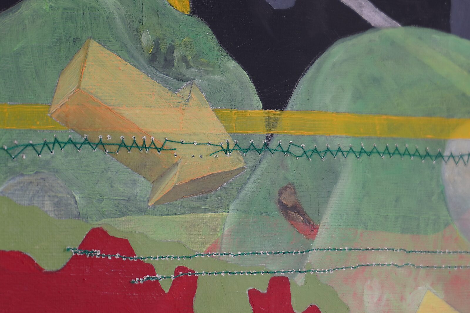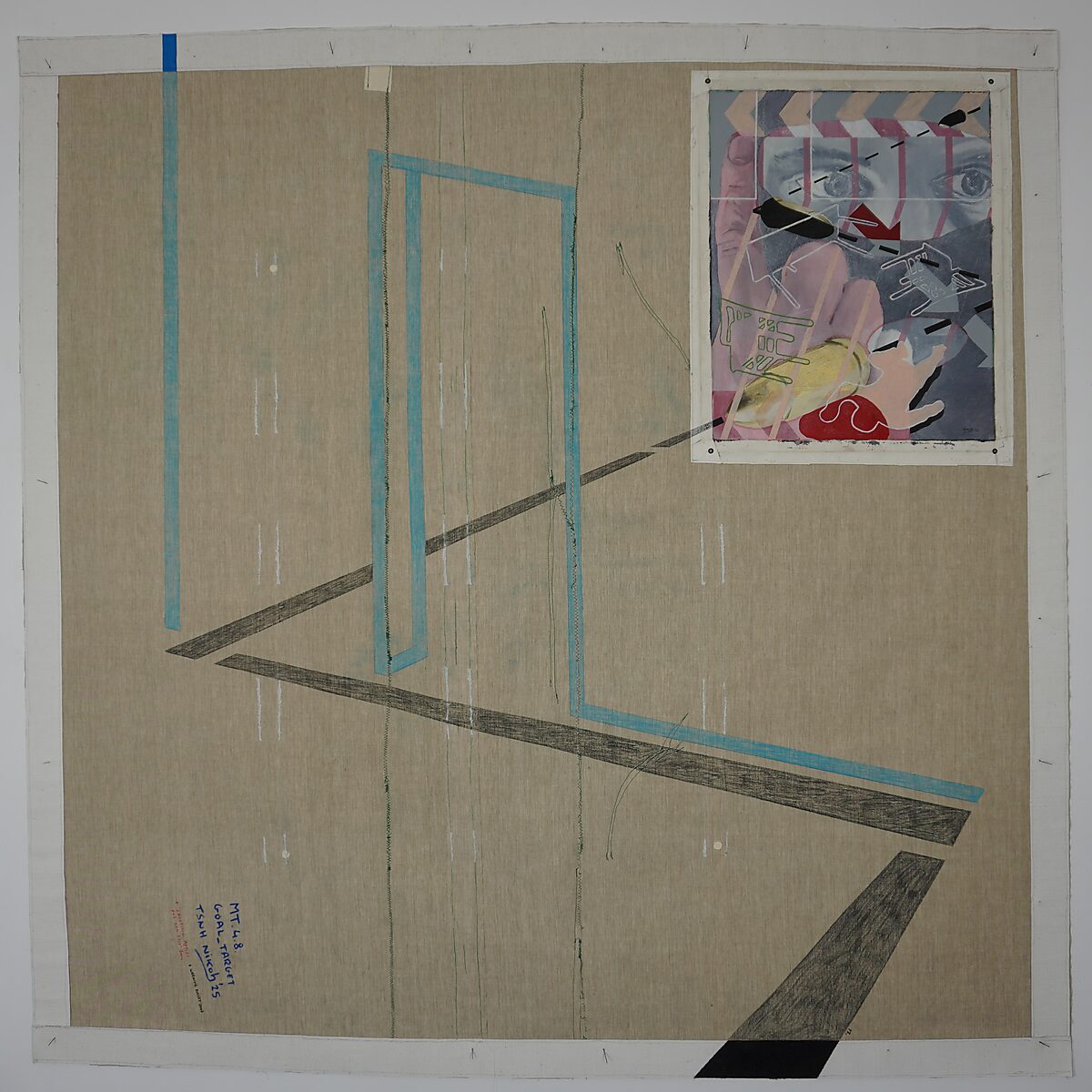 Back in my studio, I expanded the work by sewing two additional canvases onto it. For this, I used earlier works: Shooting Apples for Dogfoot (2004) and Warning Bullet (2003), both already connected to ideas of goals, aiming, and shooting. Front and back were deliberately employed; Warning Bullet was placed on the reverse, while lines from that work were compositionally enlarged and reappeared within the overall structure.
