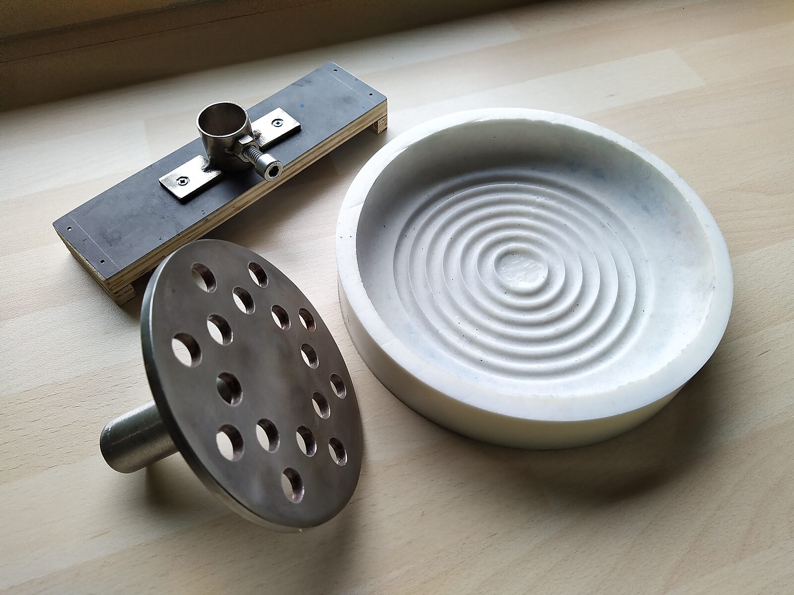 The stainless-steel moulds used to freeze the ice discs were replaced with 3D-printed holders made of yellow ABS material. This makes the installation more flexible and opens new possibilities to explore the dialogue between structure, chance, and time.