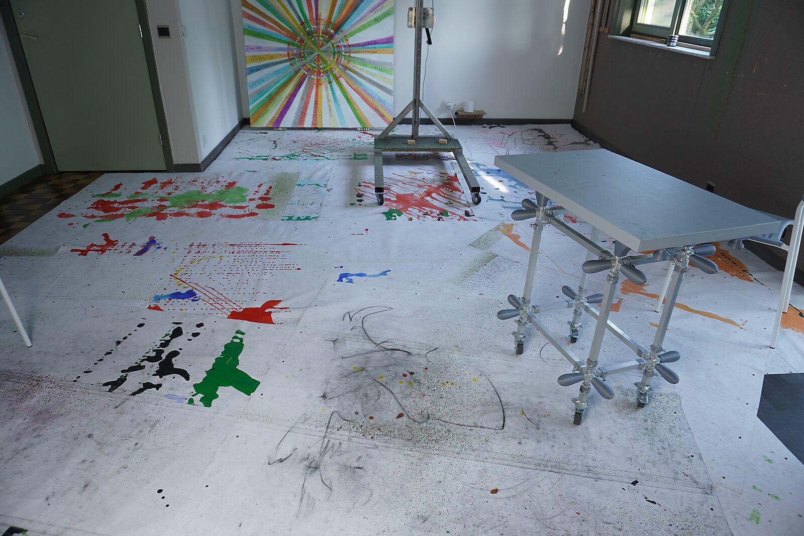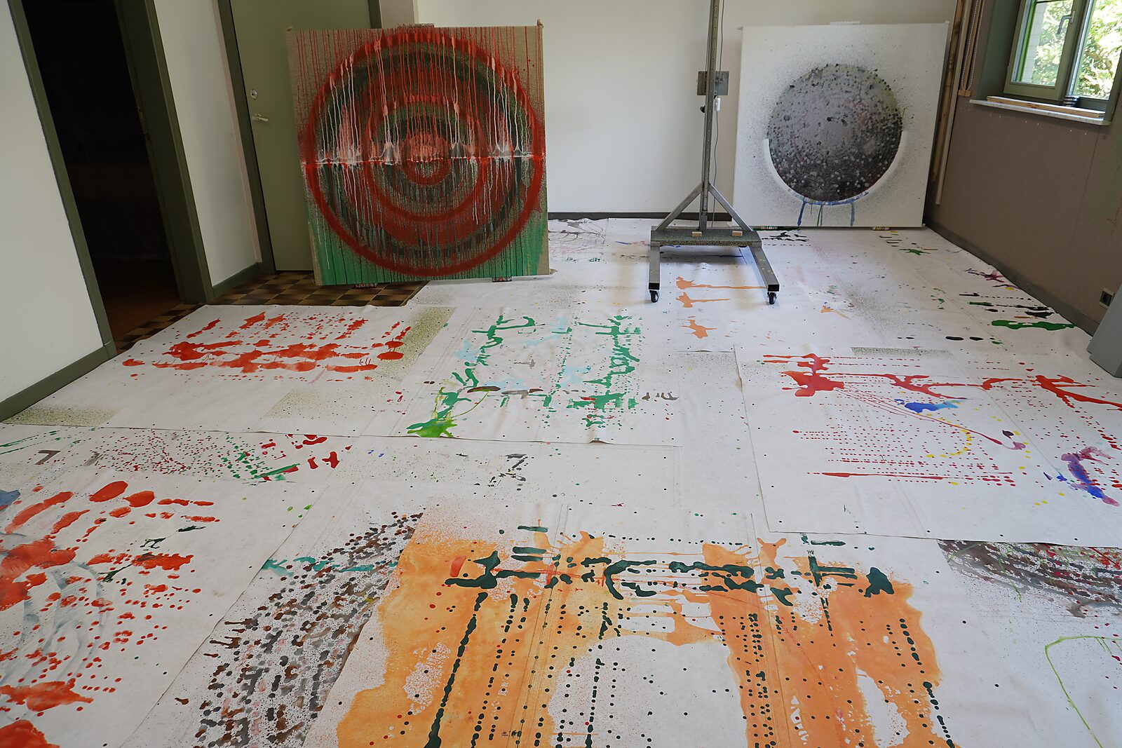 I prepared a series of 150 × 150 cm canvases with eyelets and spread them across my studio to collect traces from various activities and