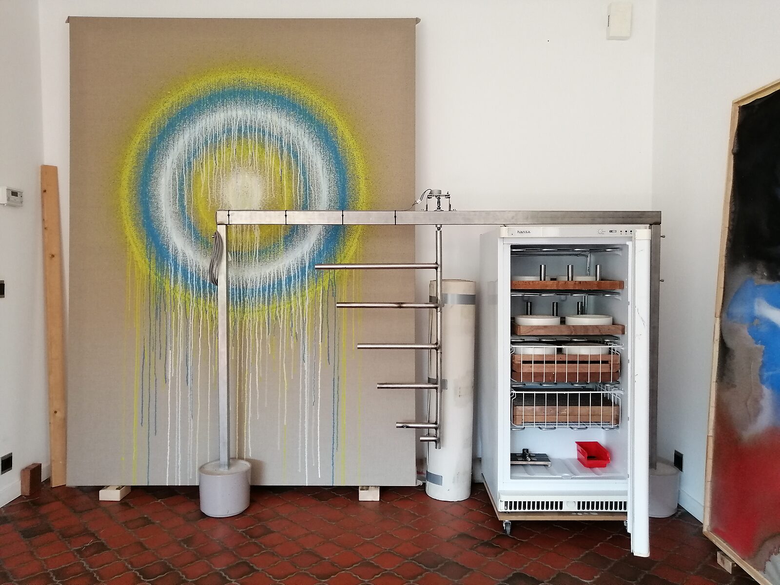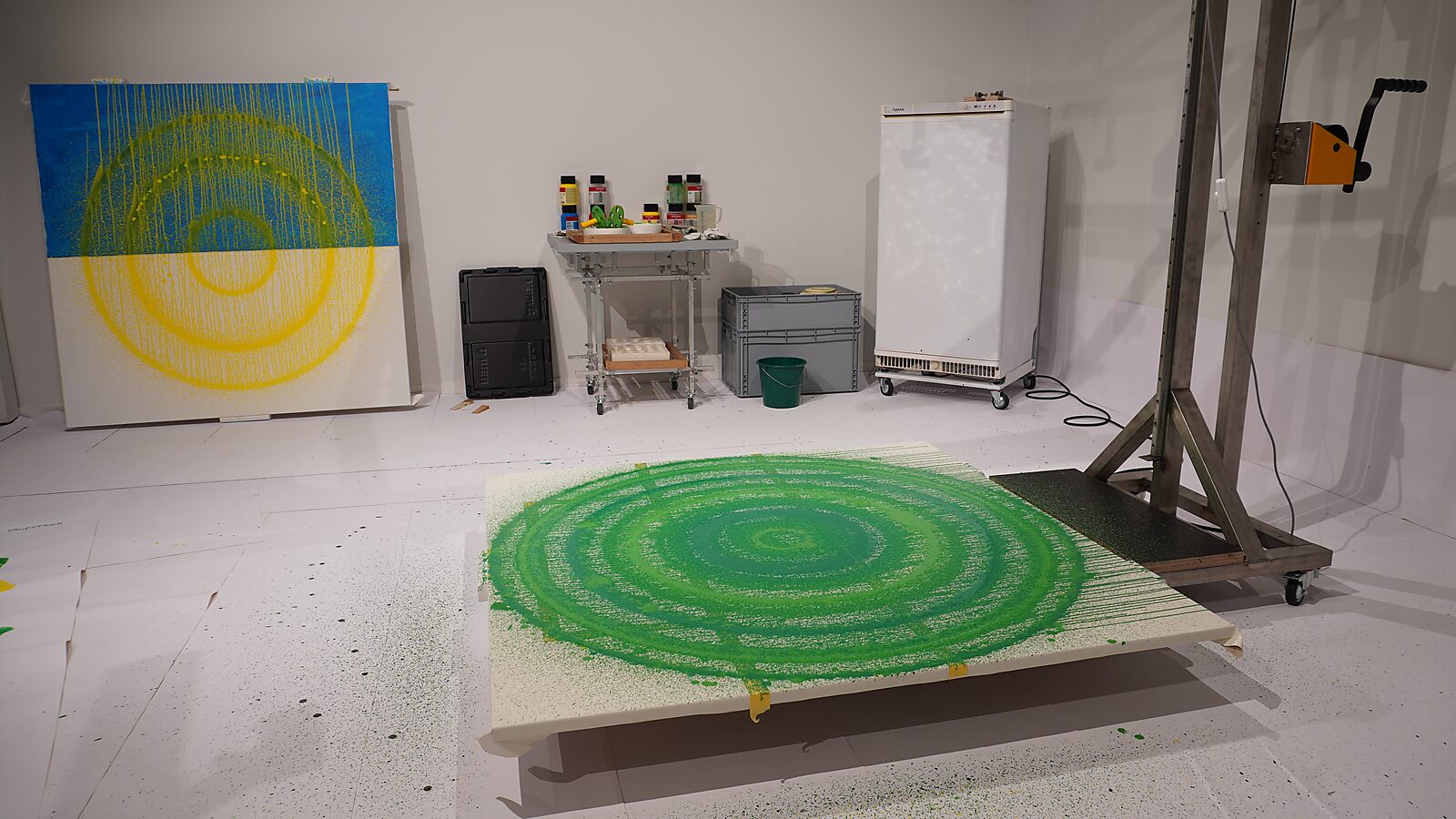 It is a performative artwork: I place a stainless-steel mould with ice discs on a canvas. As the ice melts, the coloured water drips down, evaporates, and leaves a pattern of colour behind. Depending on the mixture of pigments, the amount of paint in the ice, the ambient temperature, and the absorbency of the canvas, each work develops differentl