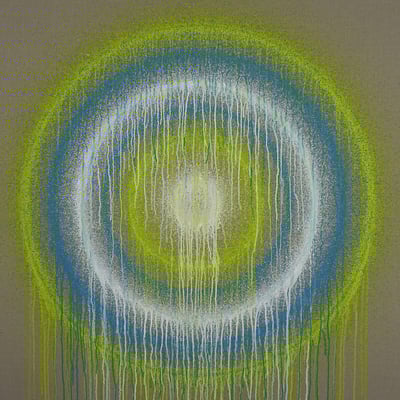 This work began during the exhibition Transformation Studio no. 1 in 2024. I started with a square canvas measuring 150 × 150 cm, onto which drops of melting ice paint in green and white were allowed to flow.