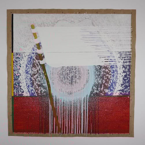 After each process is completed, the canvases are removed from their aluminium frames. Eyelets along the outer edge allow the works to be suspended freely.