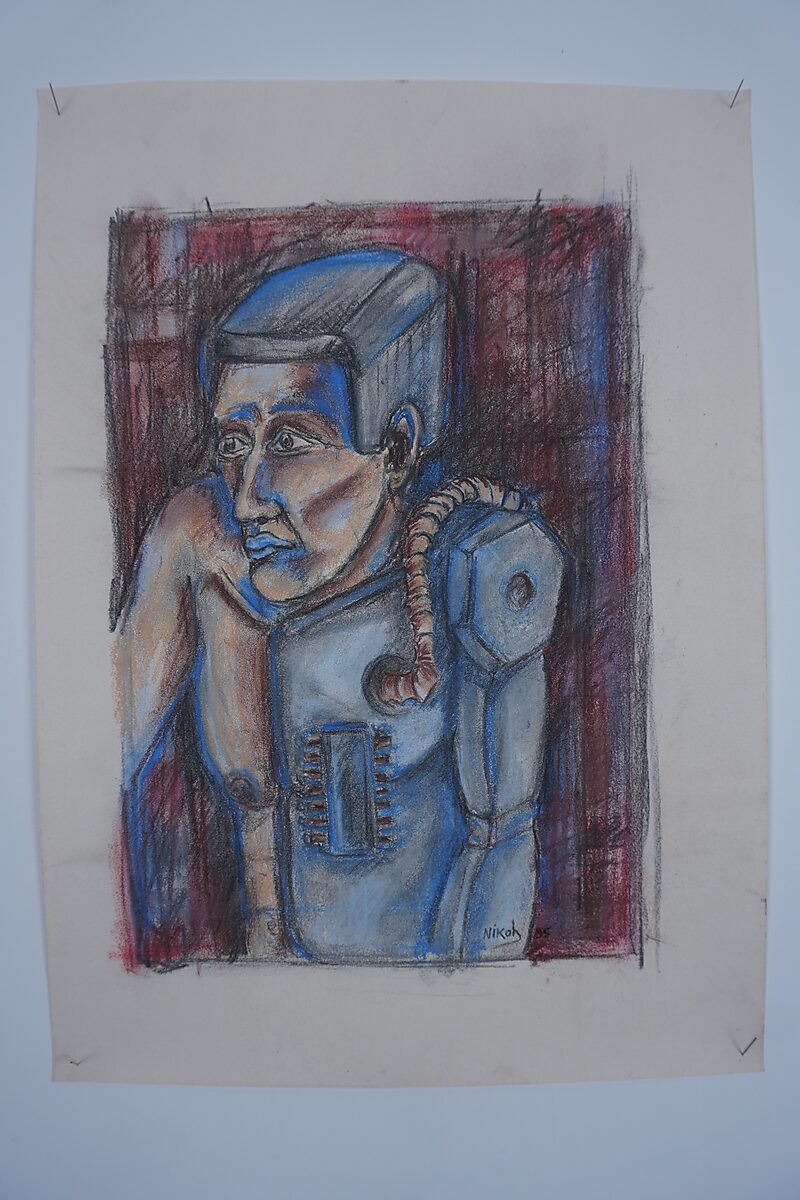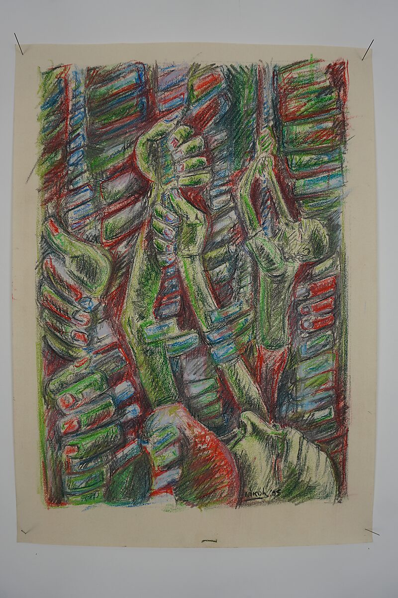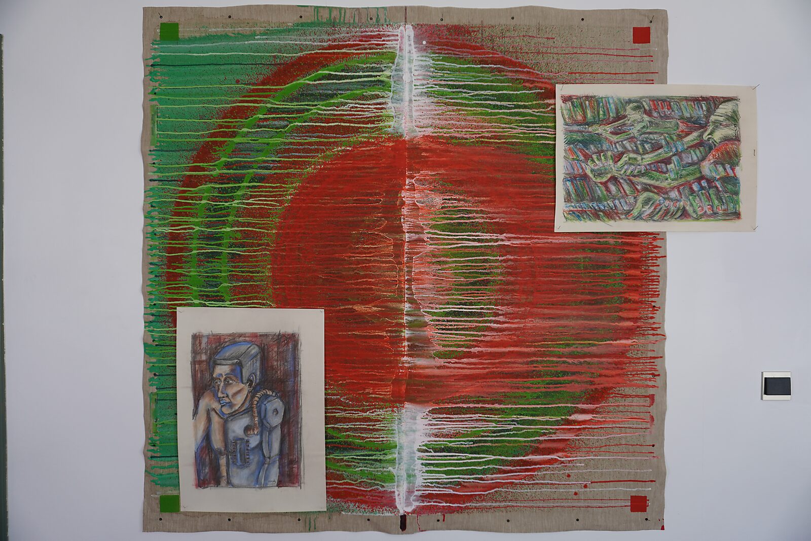 Vervolgens voegde ik twee tekeningen toe: Robotman (1995) en Hangende man (1995). Ze sloten opvallend goed aan bij de kleuren, en ook inhoudelijk tekende zich een grens af: een gerobotiseerd figuur tegenover een man die zich krampachtig aan een koord vastgrijpt.
