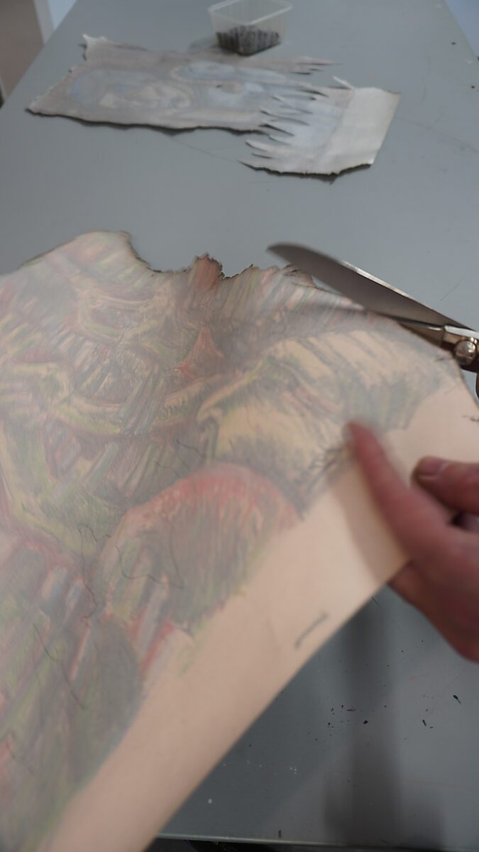 Tot slot fixeerde ik de tekeningen op het doek en tekende ik ze nog bij. Overschotten van de knipsels verbrandde ik, en de as die overbleef fixeerde ik onderaan op het doek in een brede lijn.