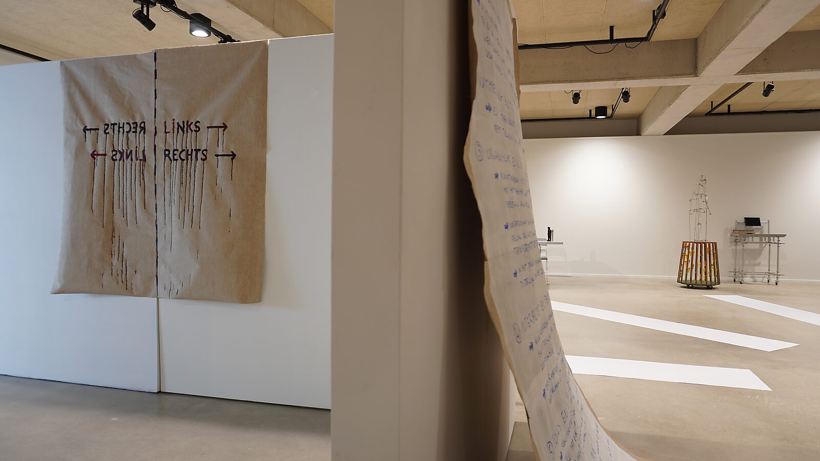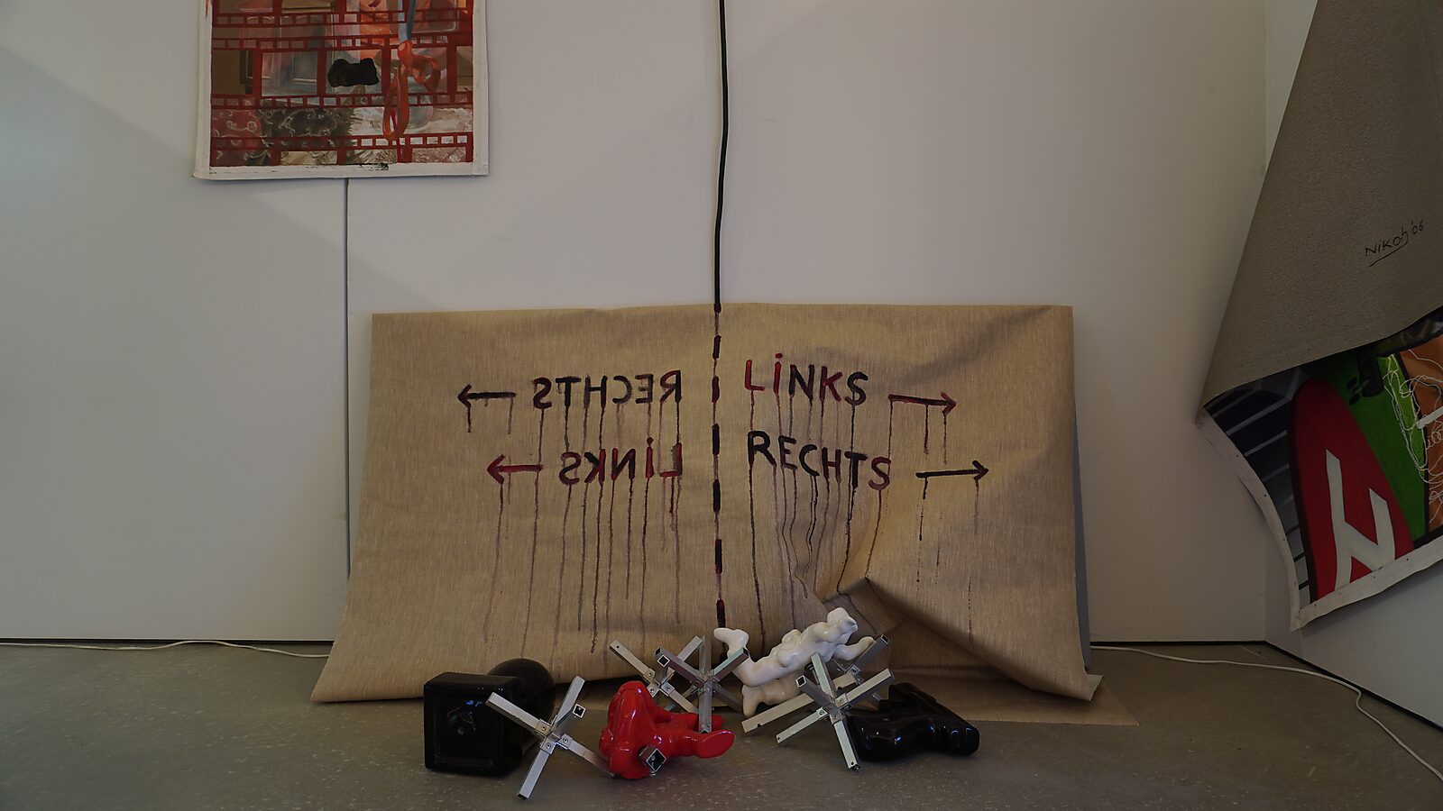 Dit doek ontstond tijdens Transformatiestudio nr. 1: warm of koud (CCDA Lommel, 2024). Aan de ingang hing het als wandwerk: een doek met de woorden “links” en “rechts”, in beide richtingen leesbaar.