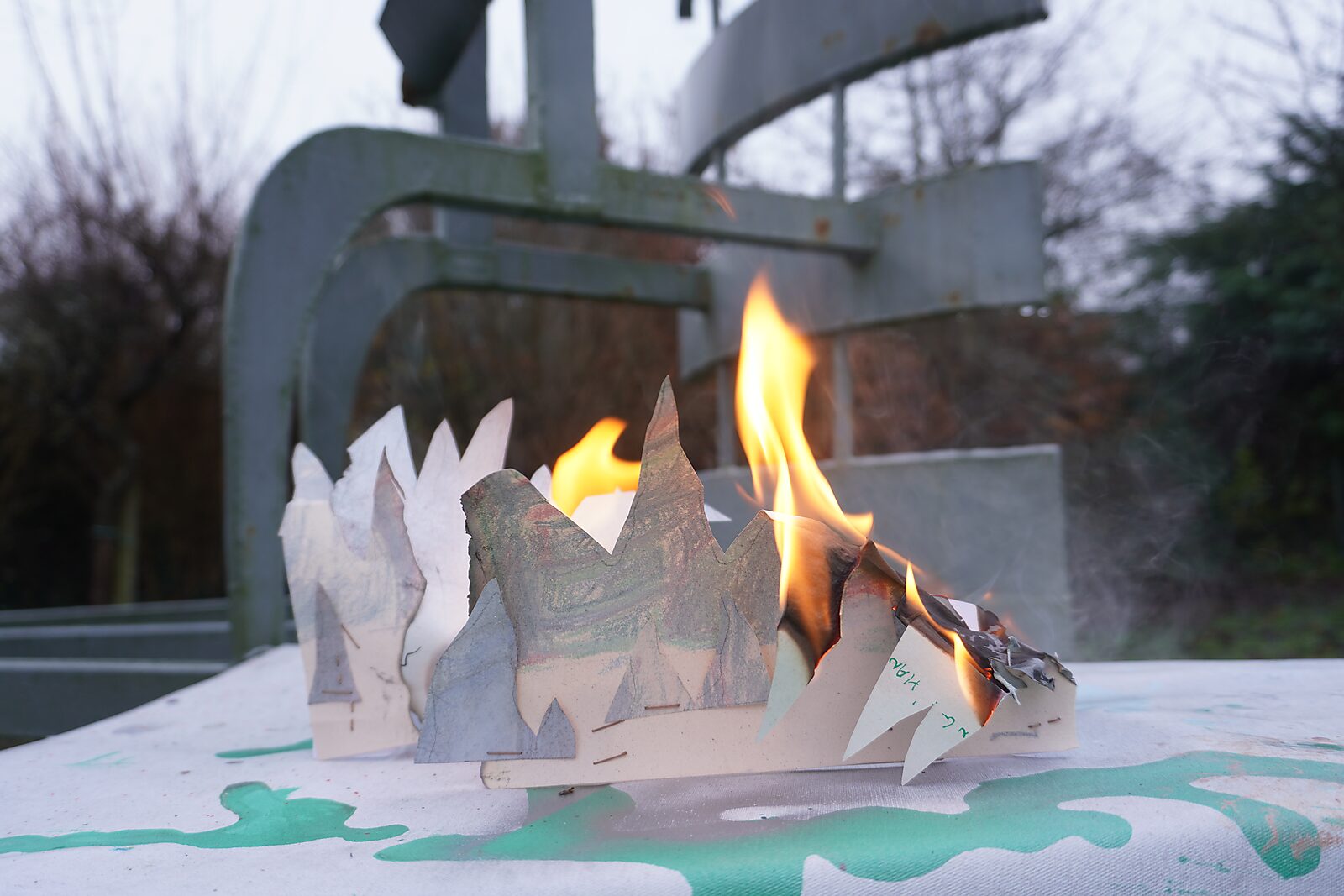 Daarna brandde ik randen van de tekeningen weg en knipte ik vlamvormen uit stukken waarin naam en datum zichtbaar bleven. Die fragmenten gebruikte ik in het project Benoemens-waardvlinders.