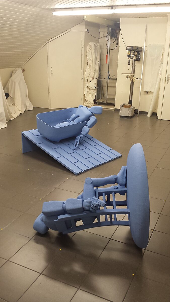 For most of us suicide is a shocking, or at least a controversial and disturbing subject. That is evidently the case in Hendrickx’ work, too, but at the same time there is a touch of irony in it: it is, indeed, a robot who commits the fatal act. This anthropoid has obviously evolved so far in his artificial intelligence that he imitates man even in his choice of death, thus denying his own existence of wiring and electronic circuitry. For a robot choosing ‘the human way’ to end his life is futile and inefficient, of course. He does not need a rope or a pistol to end his life – he merely needs to switch off the power source that keeps him running.
