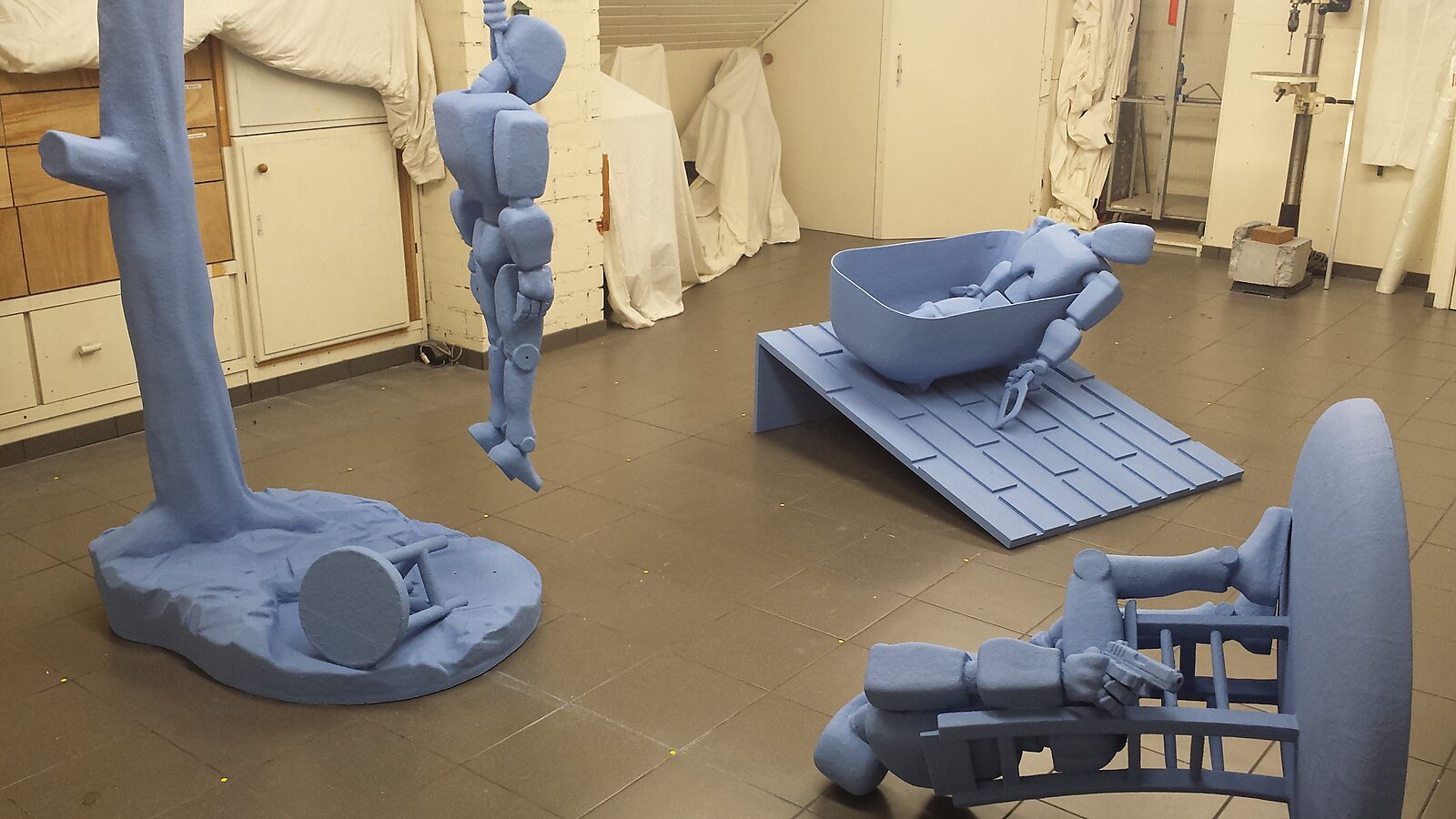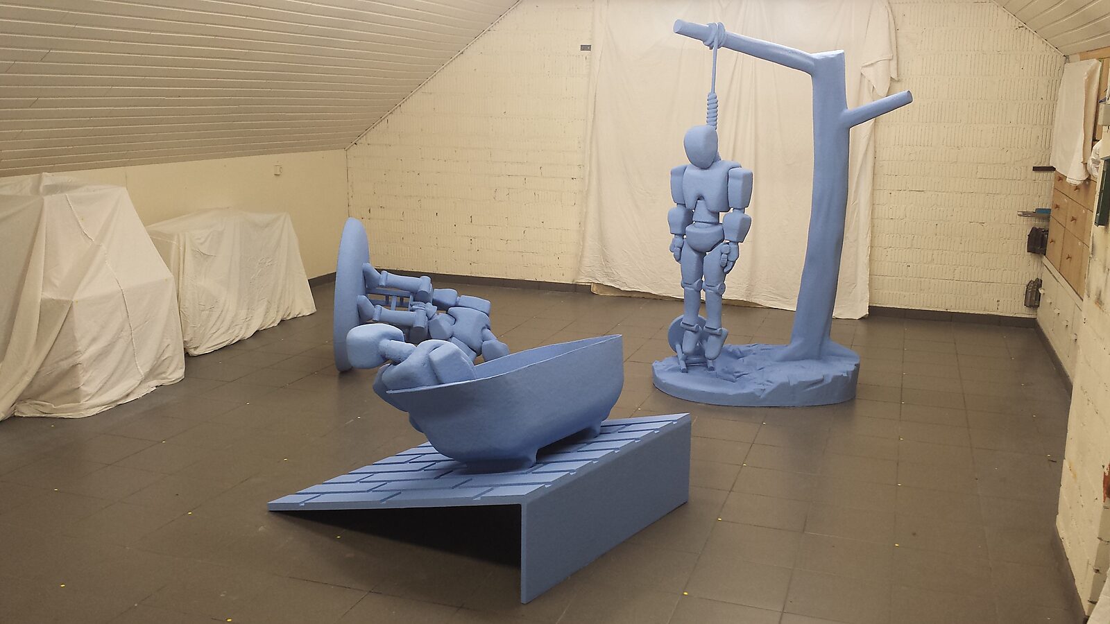 In the first phase of the project, three sculptures depict a robot attempting suicide in three different ways. The works visualize the collision between rational technology and irrational emotion — between mechanical logic and existential despair.