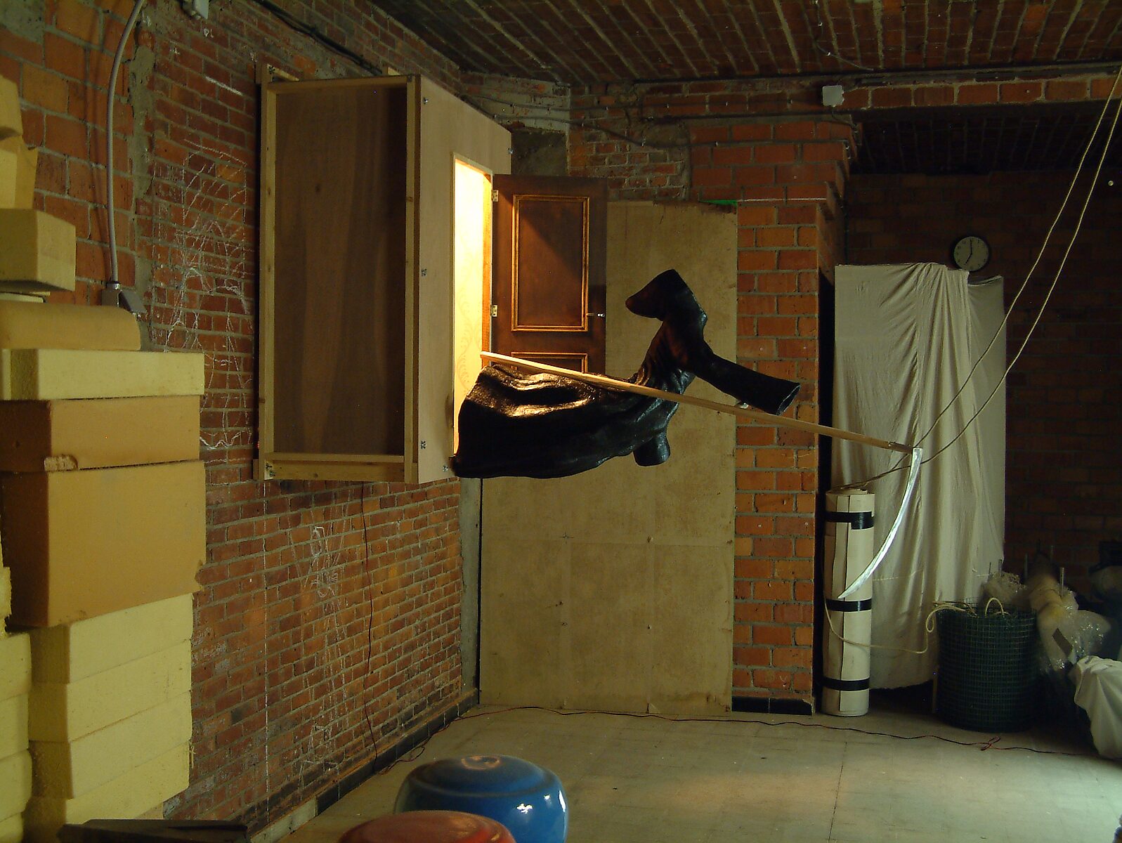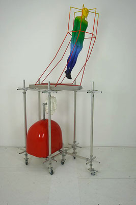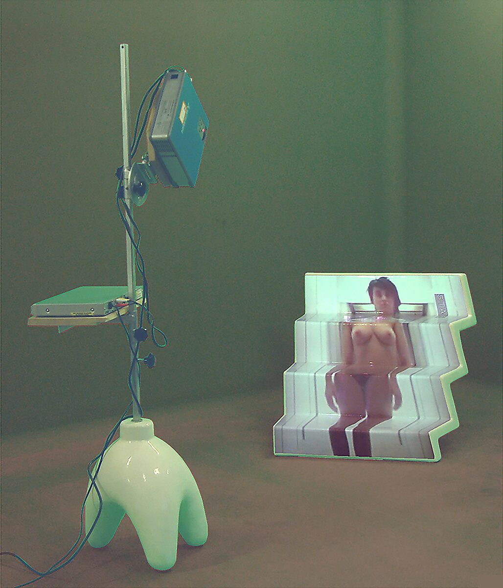 Een naakte vrouw in een lift werd gefilmd met de deur open, zodat haar lichaam van boven naar beneden in beeld verschijnt. Deze opname wordt geprojecteerd op een trapfragment, vervaardigd uit polyurethaanschuim en polyester. Vanuit een bepaalde kijkhoek lijkt het lichaam niet zomaar naar beneden te bewegen, maar te vloeien — als een vloeibare aanwezigheid die zich langs de treden uitstrekt.