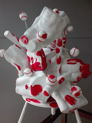 Een koning die vastklampt aan zijn macht, gezeten op zijn troon. Zijn lichaam is ontdaan van spieren; enkel de organen blijven schematisch zichtbaar. Rond zijn kroon cirkelen pistolen als symbolen van dreiging en controle. In de troon is een trap naar binnen verwerkt, waaruit een rode loper stroomt die zich als een cirkel rond het beeld ontvouwt.