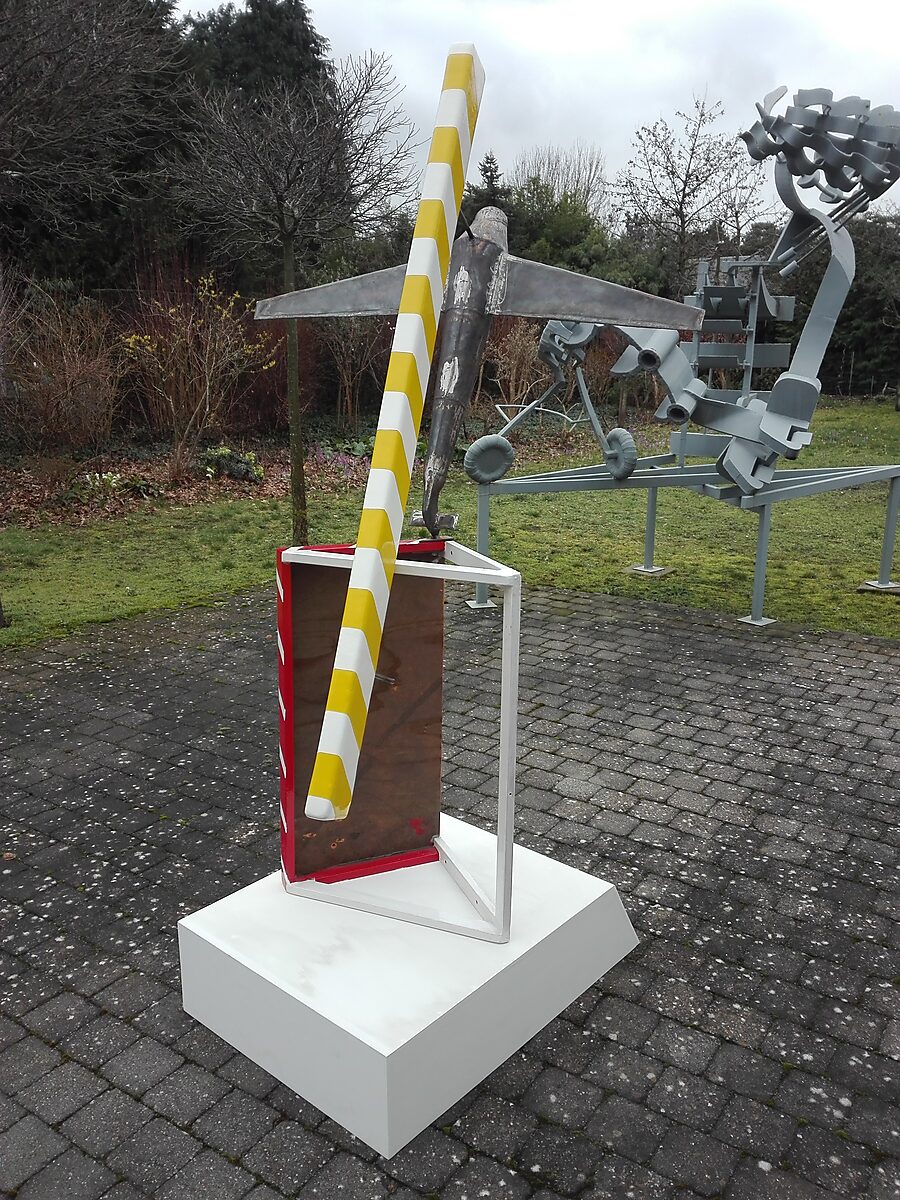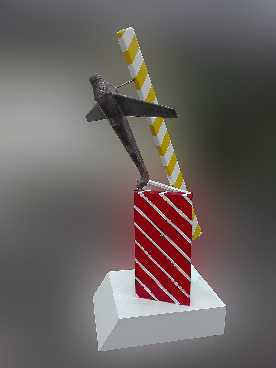 Het werk Gelovige vliegtuigen toont een vliegtuig als kruisbeeld. Het verwijst tegelijk naar religie en naar het bredere “geloven in iets”. De vorm roept ook een menselijke figuur op. De strepen symboliseren afbakening — regels, procedures en patronen zoals die in de luchtvaart gelden. Het vliegtuig helt voorover, in een houding die een val suggereert. Toch wordt die val opgevangen door de geel-witte balk, alsof de hoop blijft hangen op de rand van de ondergang.