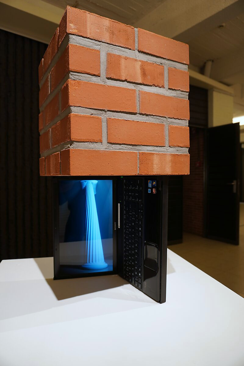 De zuil die op de laptop verschijnt, is afkomstig uit mijn videowerk Spiraal van macht (2018), onderdeel van het onderzoeksgebied Virtuele transformaties. Waar de zuil daar enkel digitaal bestond, krijgt ze in Het digitale tijdperk een fysieke tegenhanger: de laptop en het bakstenen blok. Zo raken virtuele en reële materie letterlijk met elkaar verbonden — de digitale wereld draagt de fysieke, en omgekeerd.
