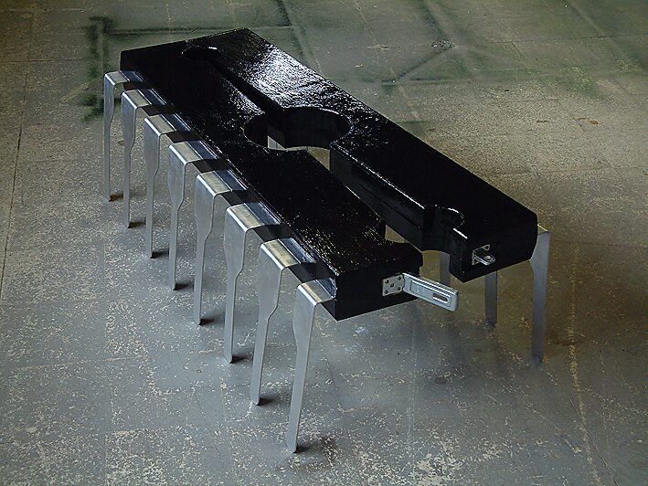 De vorm verwijst tegelijk naar het oude schandblok, waarin overtreders publiek werden tentoongesteld. Deze dubbele betekenis schept een spanning: technologie biedt ons macht en mogelijkheden, maar kan ons ook knechten en te kijk zetten. De chip wordt zo een hedendaagse schandpaal — een symbool van zowel vooruitgang als afhankelijkheid, van controle en verlies van autonomie.