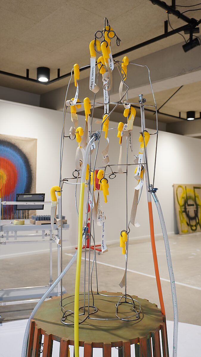 The ribbons can be tied to an empty discharge piece and then attached to the sculpture — at the top if the words should or must be spoken, at the bottom if they are better left unsaid. Other visitors may rearrange the ribbons at will. In this way, the sculpture remains in a state of continuous reordering.