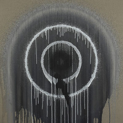 Smeltende doelen nr. 3 is een doorontwikkeling van de eerste twee versies. In plaats van een metalen statief op het doek te plaatsen, bevestig ik de ijsschijven aan een ronddraaiende metalen constructie die boven het canvas hangt. Terwijl de schijven smelten en draaien, vormen ze al druppelend een nieuw, groot doel op het doek.