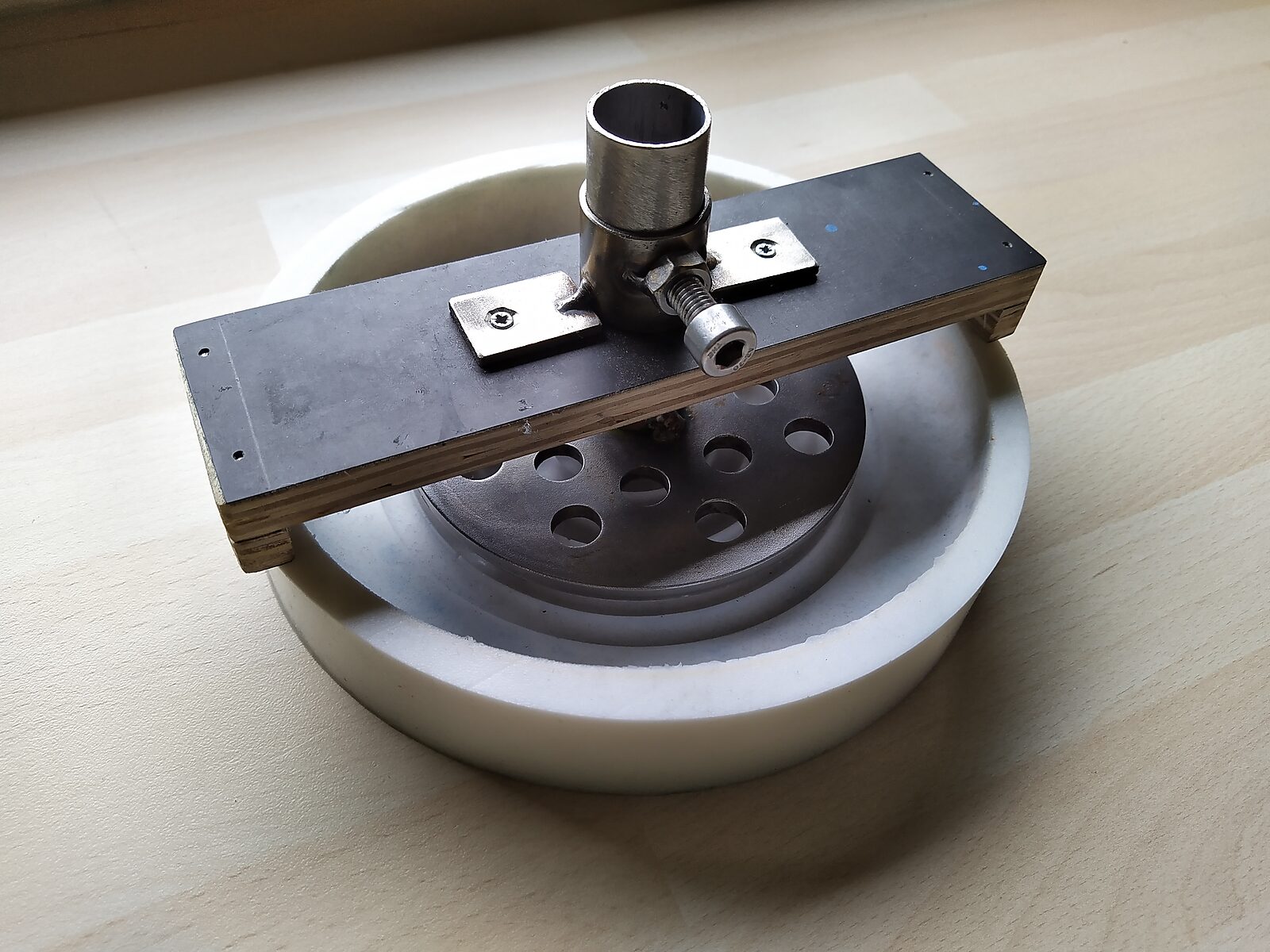 Deze versie, gemonteerd op wieltjes, is gemakkelijk verplaatsbaar en laat toe zowel de hoogte van de ijsschijven als de diameter van de cirkels eenvoudig aan te