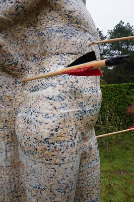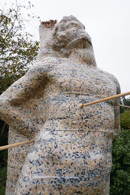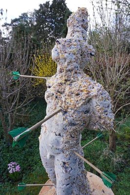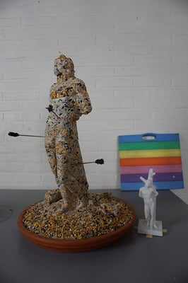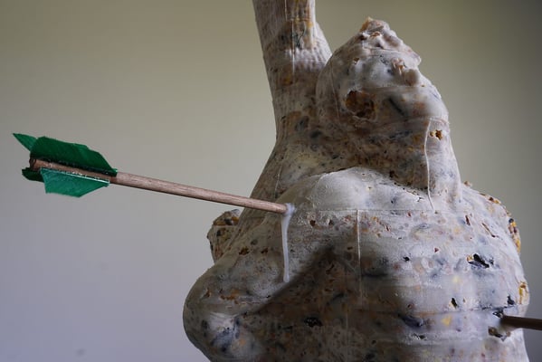 The first small version of the sculpture was created using 3D software and 3D printing. A scan of Adonis (1808) by Bertel Thorvaldsen formed the basis, adapted to the pose of Rubens’ St. Sebastian (ca. 1614). With a 3D print and a silicone mold, a negative form was made, which was then filled with melted fat balls and birdseed. In this way, an edible sculpture emerged, left to the mercy of the birds.
