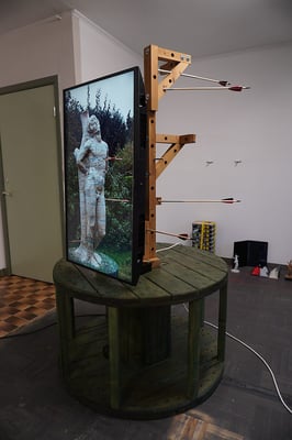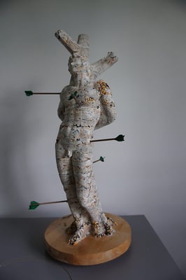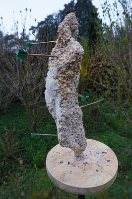 A virtual 3D model finds its way into reality through a printed mold, filled with fat and birdseed. Saint Sebastian, pierced by arrows, reappears again and again in shifting guises: constructed, deformed, tested. Birds take on an unexpected role, at once sculptors shaping the work and eaters slowly making it disappear.