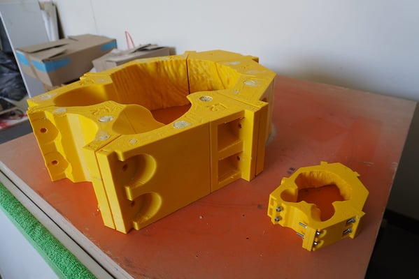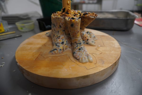 In the second stage, an attempt was made to create a sculpture about sixty centimeters tall. For this purpose, a completely new mold was designed in 3D, with the aim of releasing it smoothly from the delicate mixture of fat and birdseed. The mold was printed in yellow ABS filament.