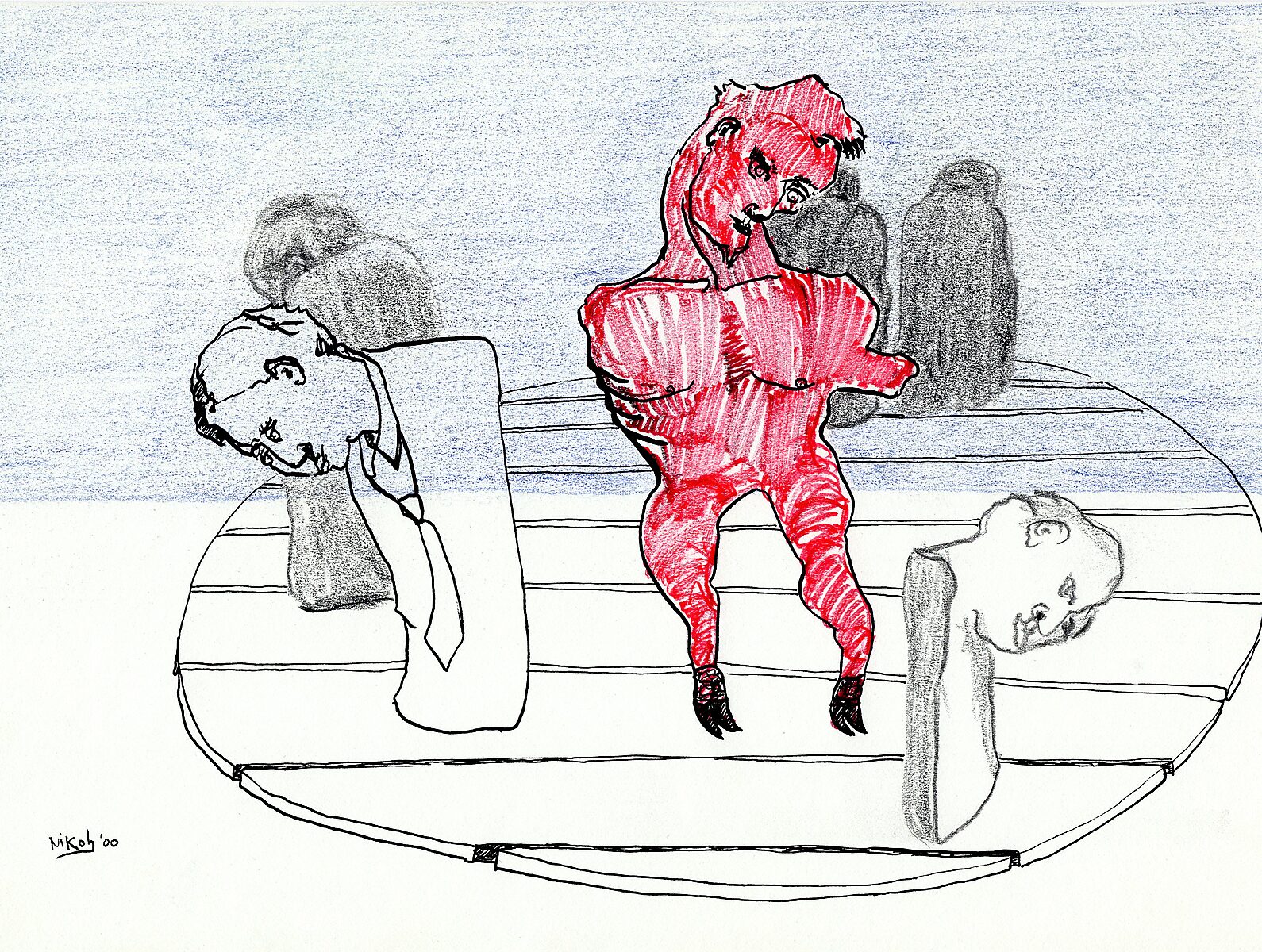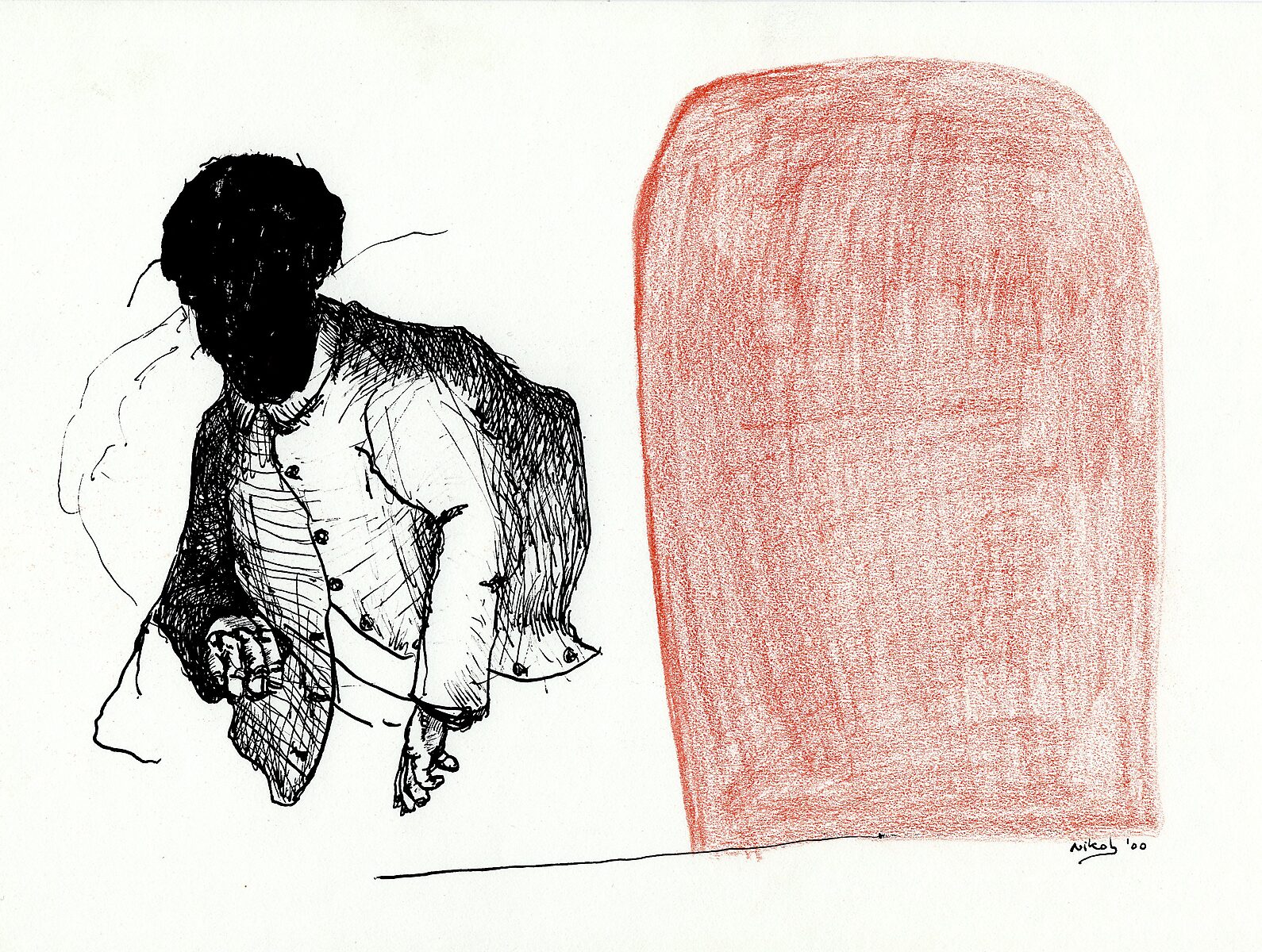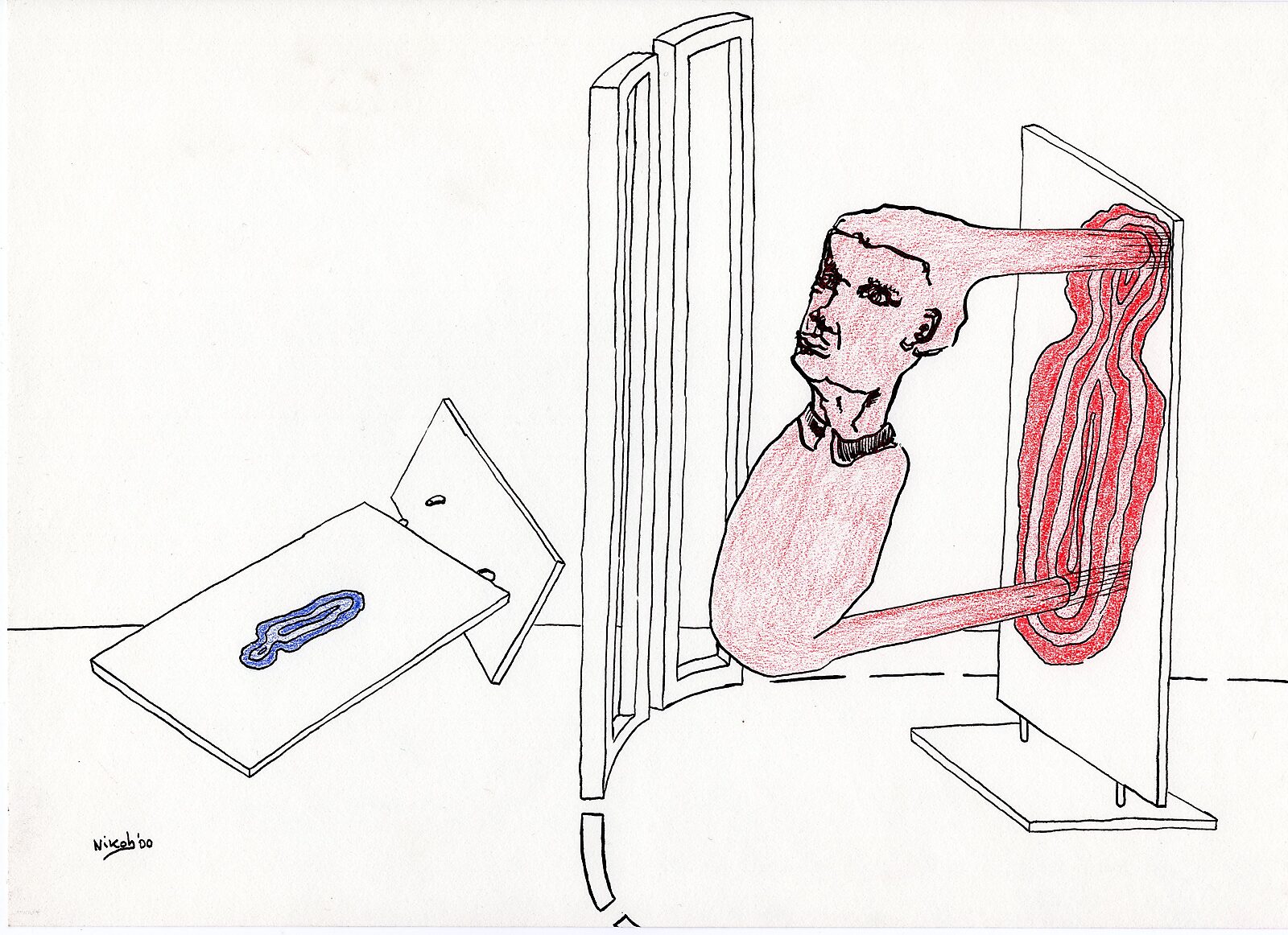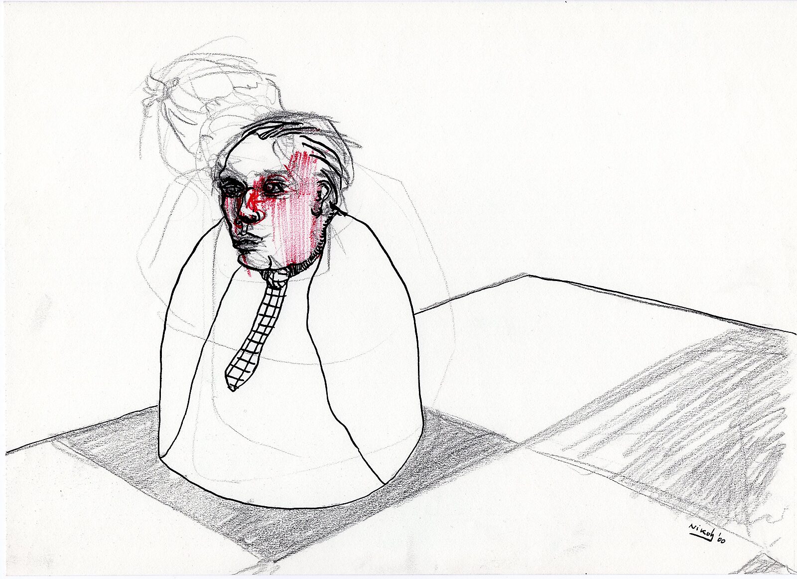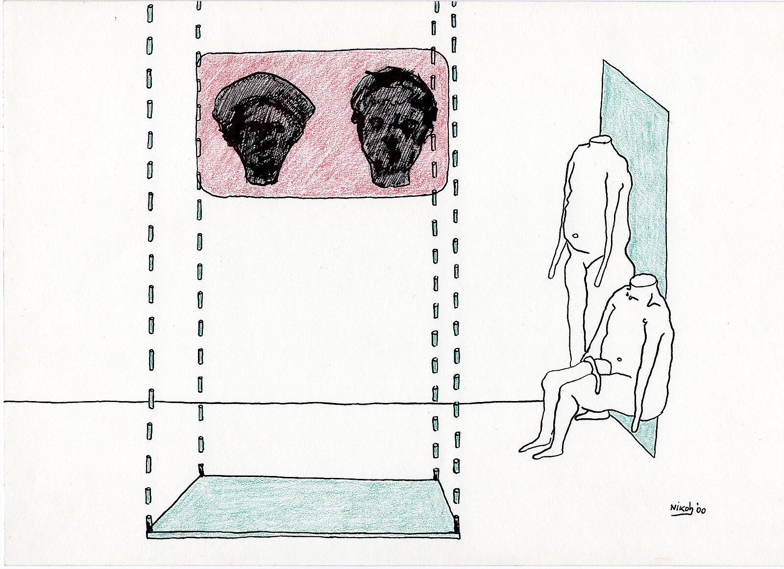 Een reeks inkt- en potloodtekeningen uit 2000, zonder uitgewerkt concept, verbonden door een bevreemdende, onbestemde sfeer.