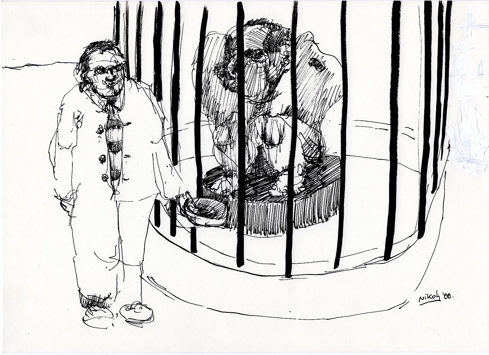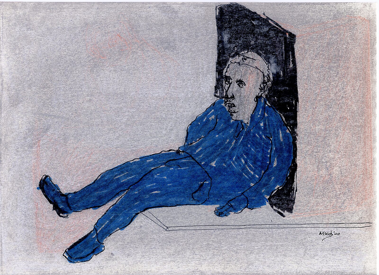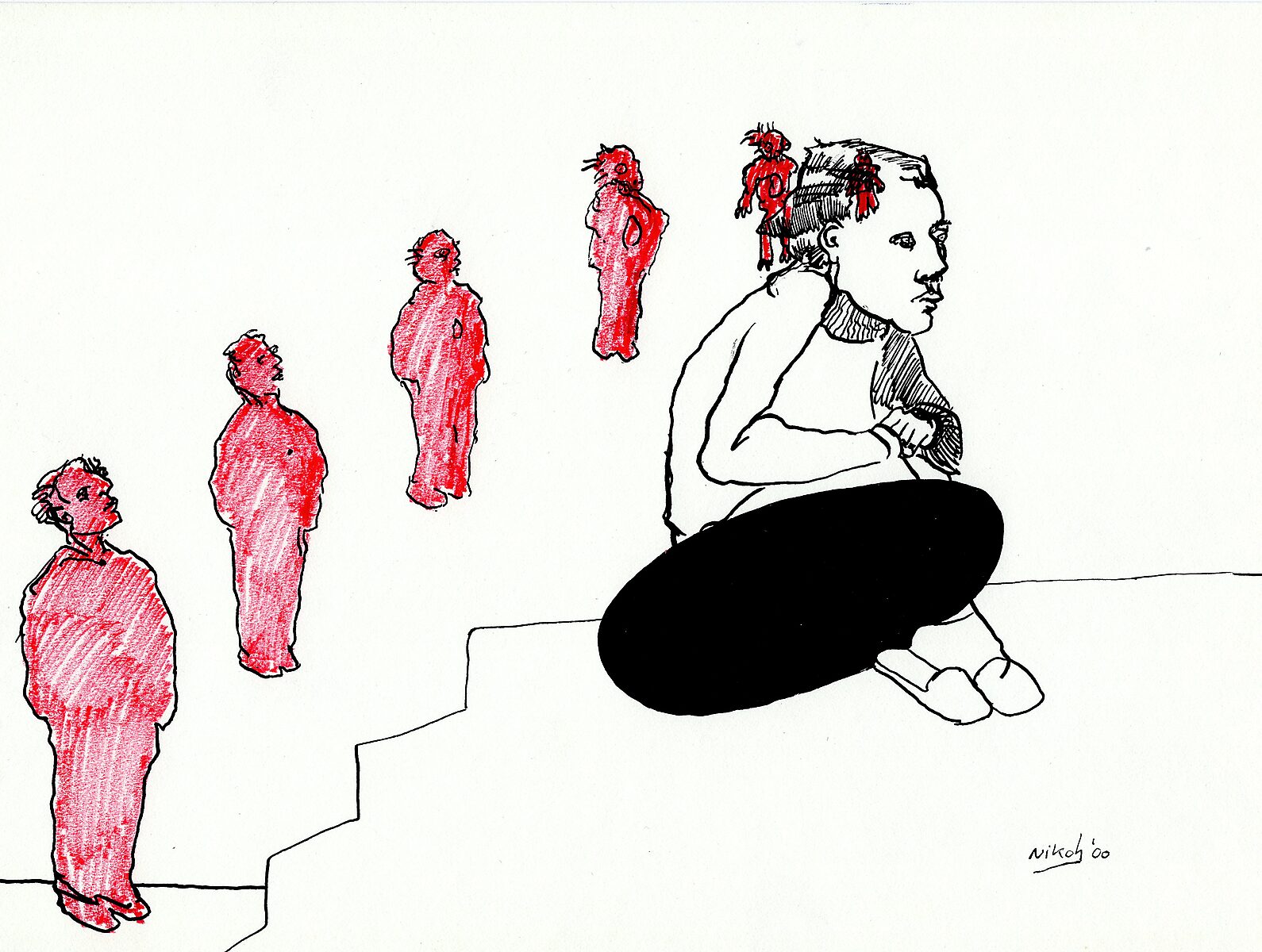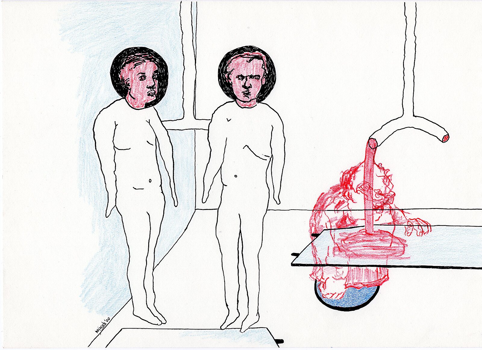 Een reeks inkt- en potloodtekeningen uit 2000, zonder uitgewerkt concept, verbonden door een bevreemdende, onbestemde sfeer.