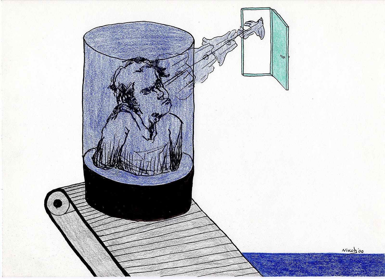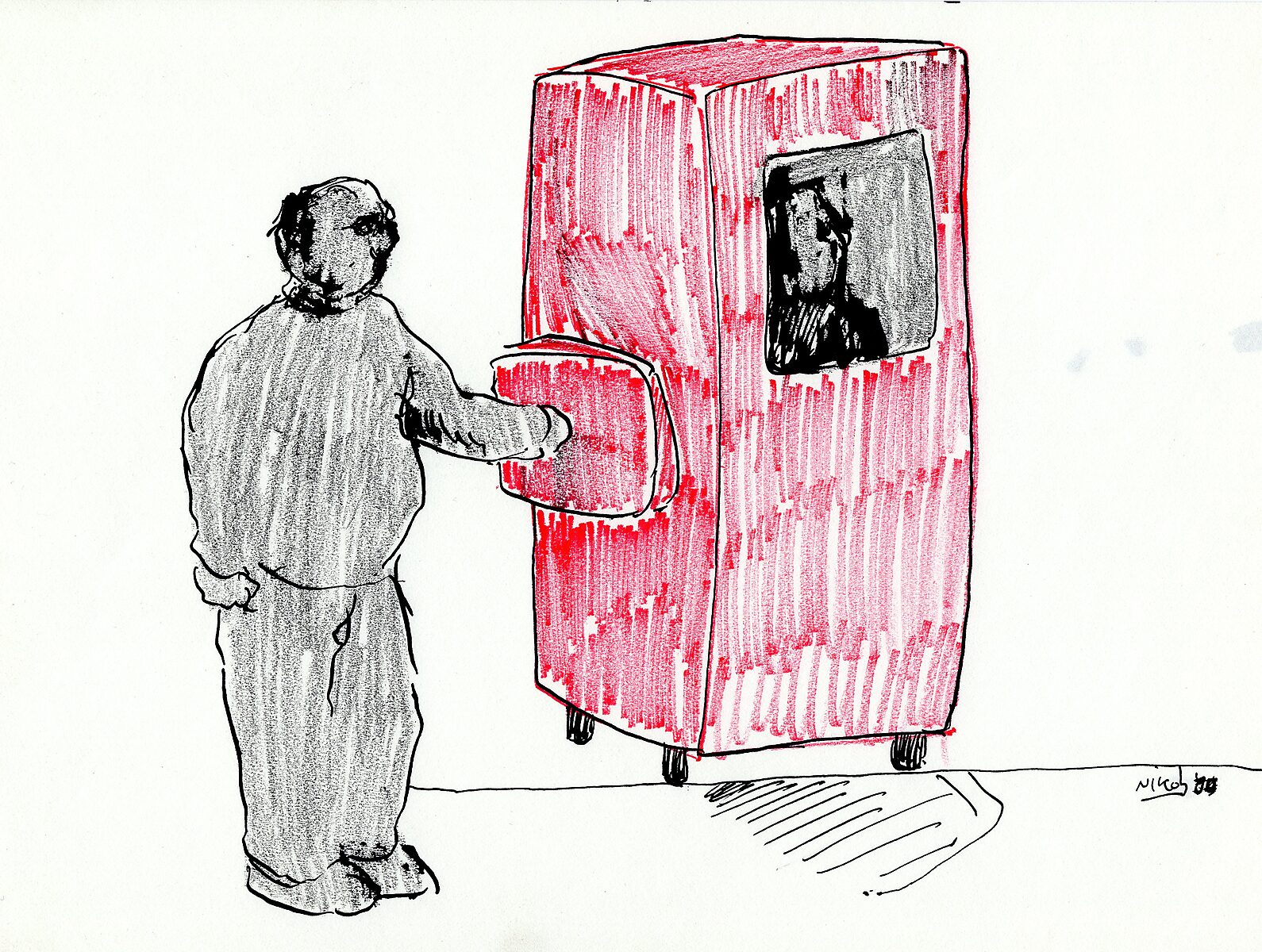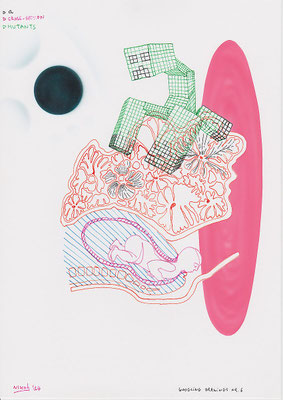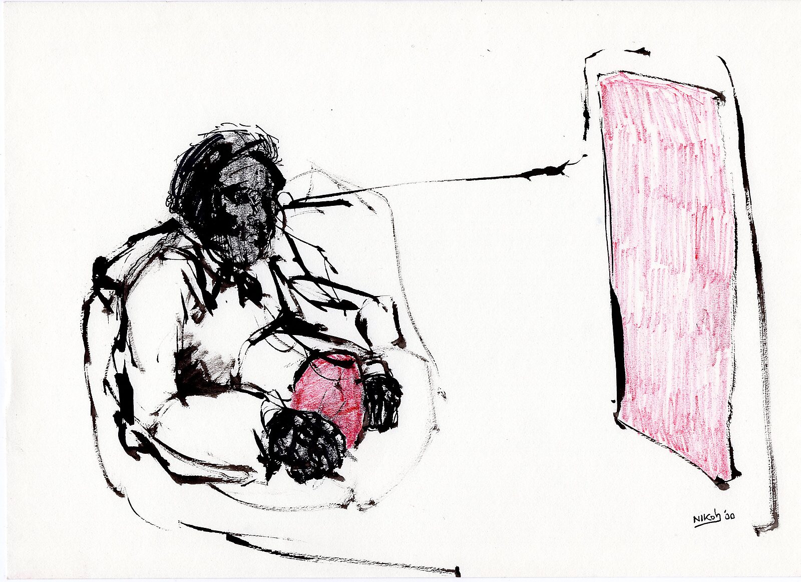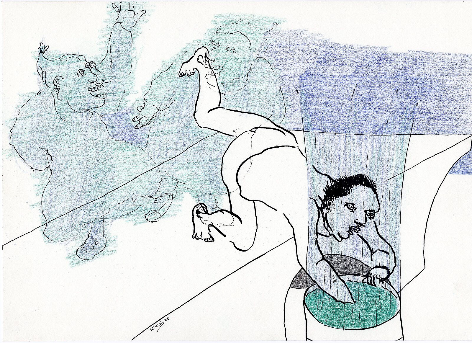 Een reeks inkt- en potloodtekeningen uit 2000, zonder uitgewerkt concept, verbonden door een bevreemdende, onbestemde sfeer.
