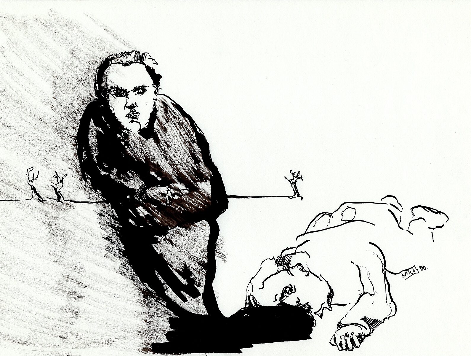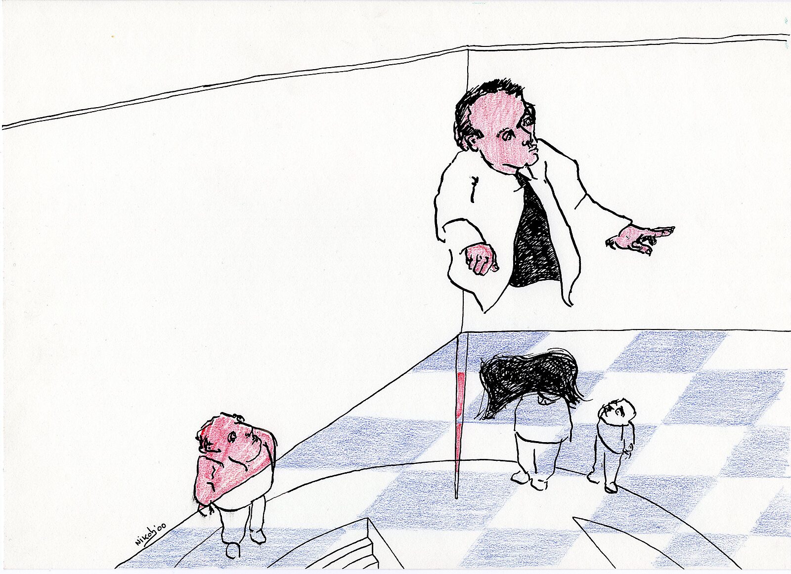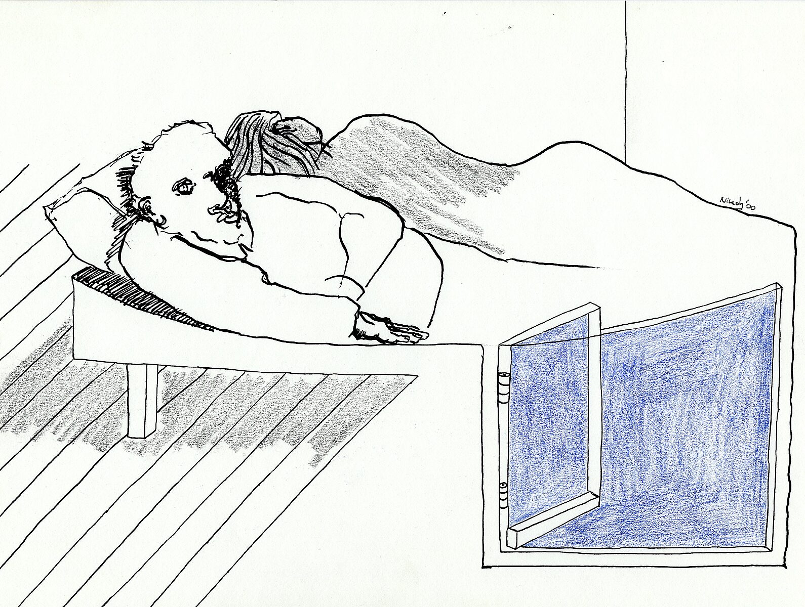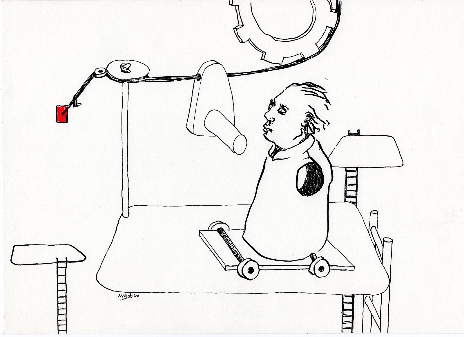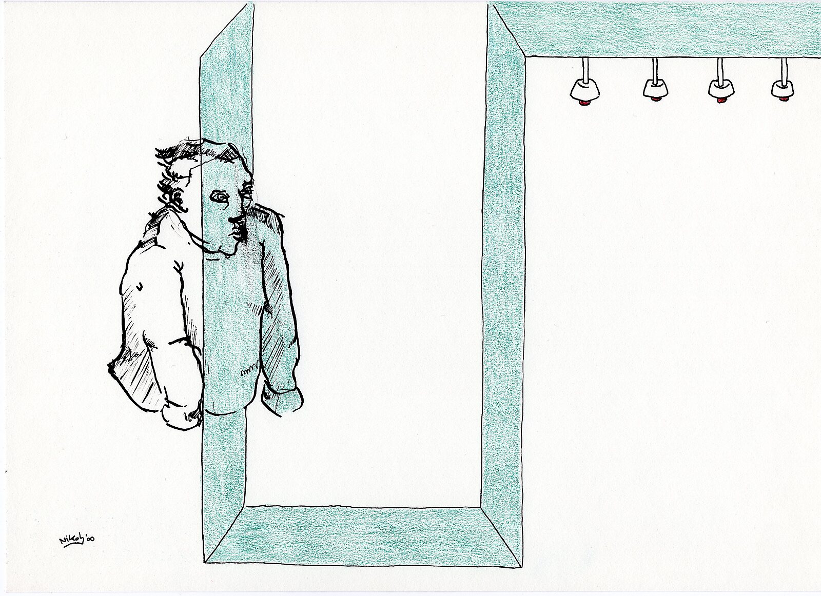 Een reeks inkt- en potloodtekeningen uit 2000, zonder uitgewerkt concept, verbonden door een bevreemdende, onbestemde sfeer.