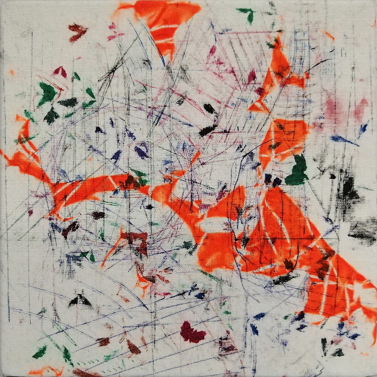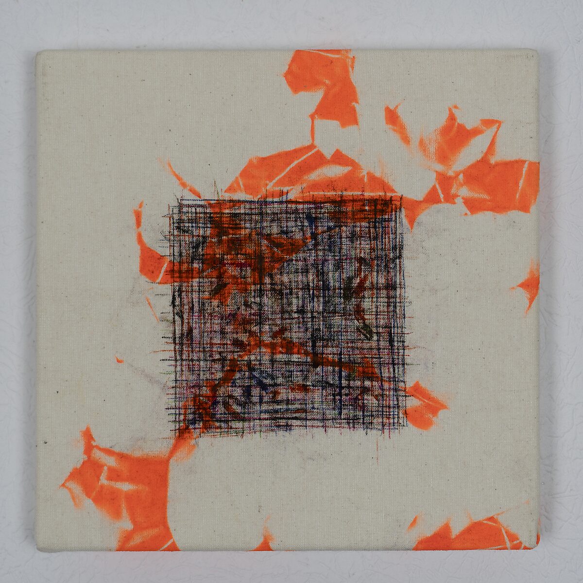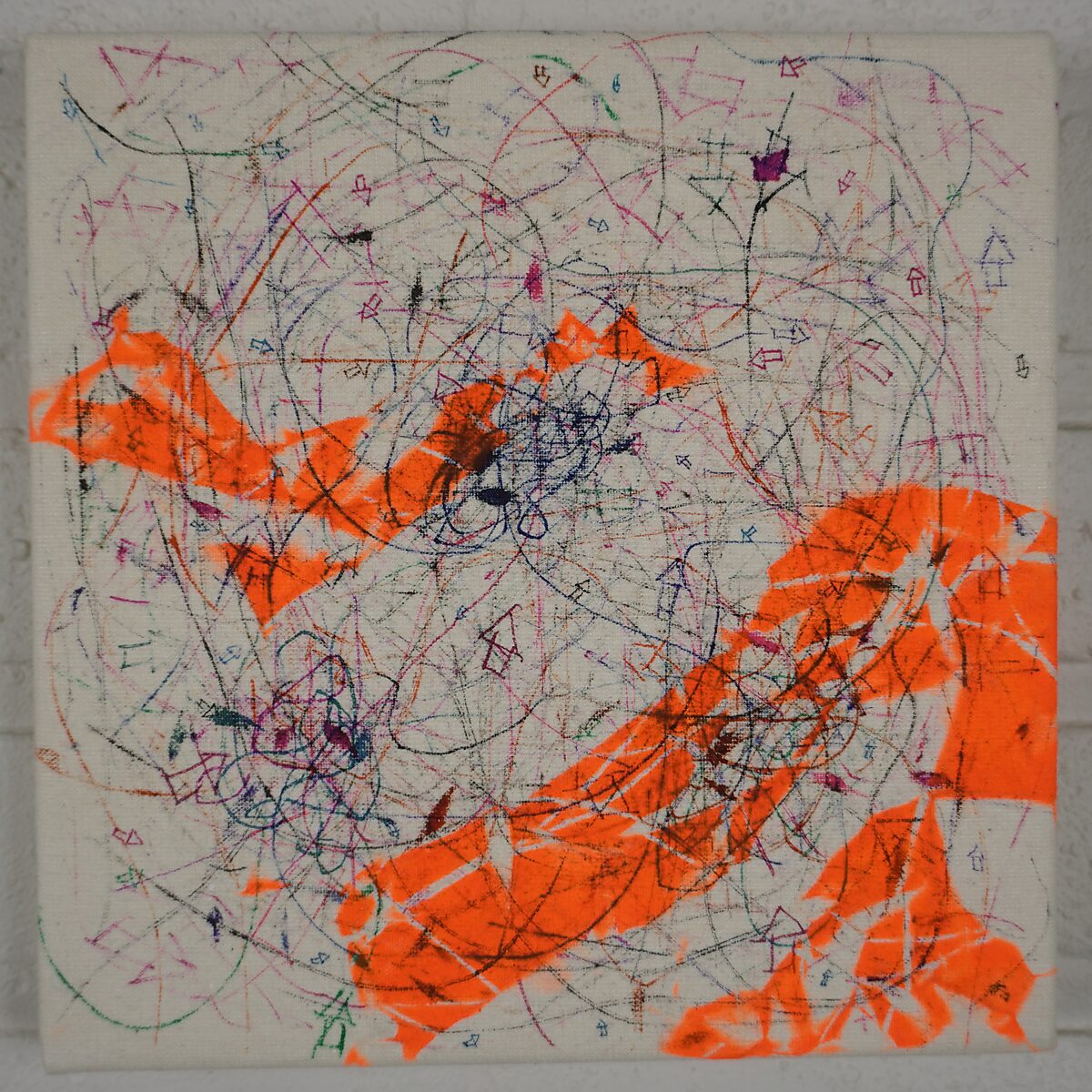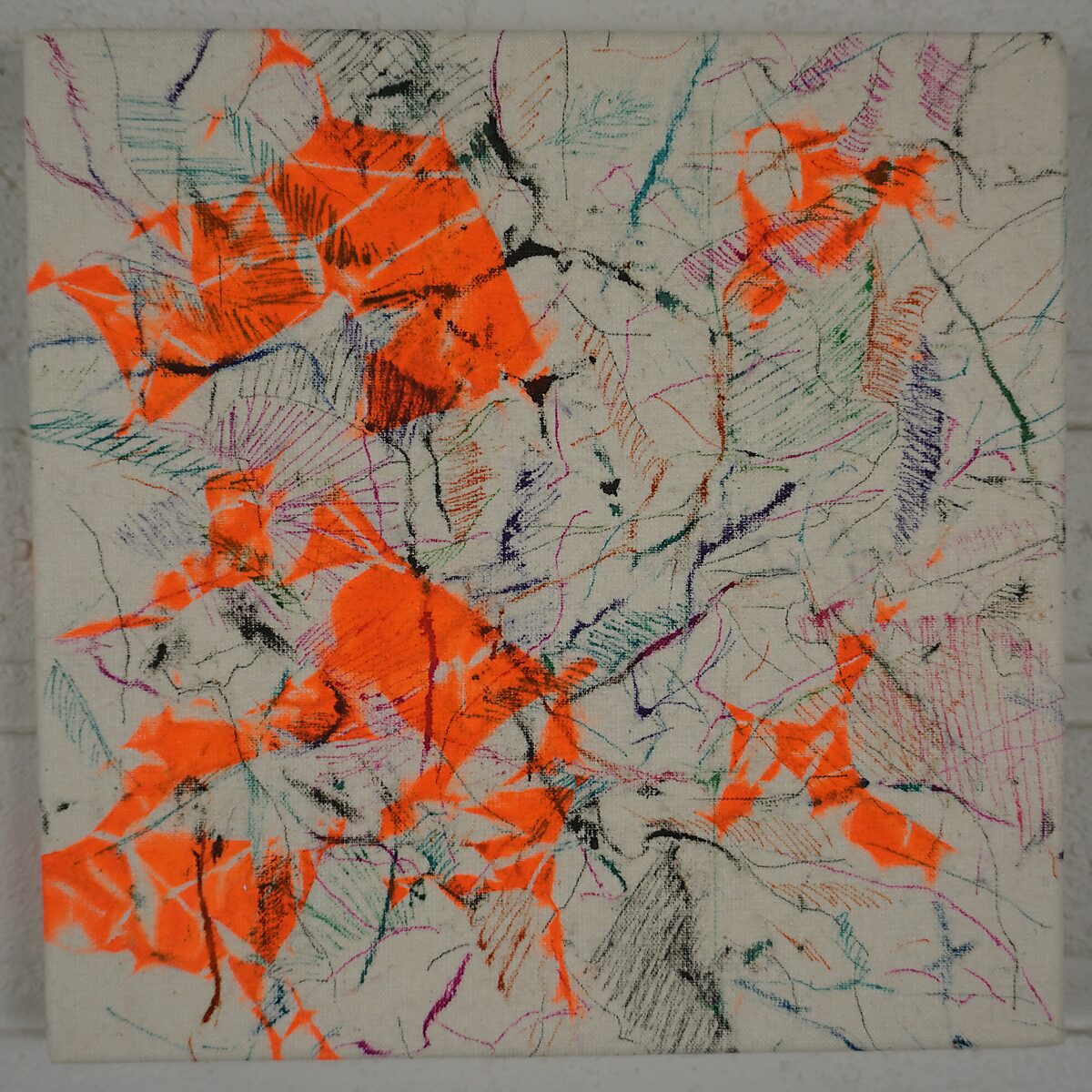 Tijdens het tekenen met gekleurde inkt en potloden gebruikt de kunstenaar kleine katoenen doekjes om restjes inkt op af te vegen. Wanneer zo’n doekje verzadigd raakt met sporen van lijnen en kleuren, rolt hij het op tot een bundeltje dat hij met koord vastbindt. Daarna spuit hij het geheel in met fluorescerend oranje verf. Zodra de verf droog is, maakt hij het doekje opnieuw los en spant het op in een kader. Zo wordt een eenvoudig hulpmiddel uit het tekenproces een autonoom kunstwerk.