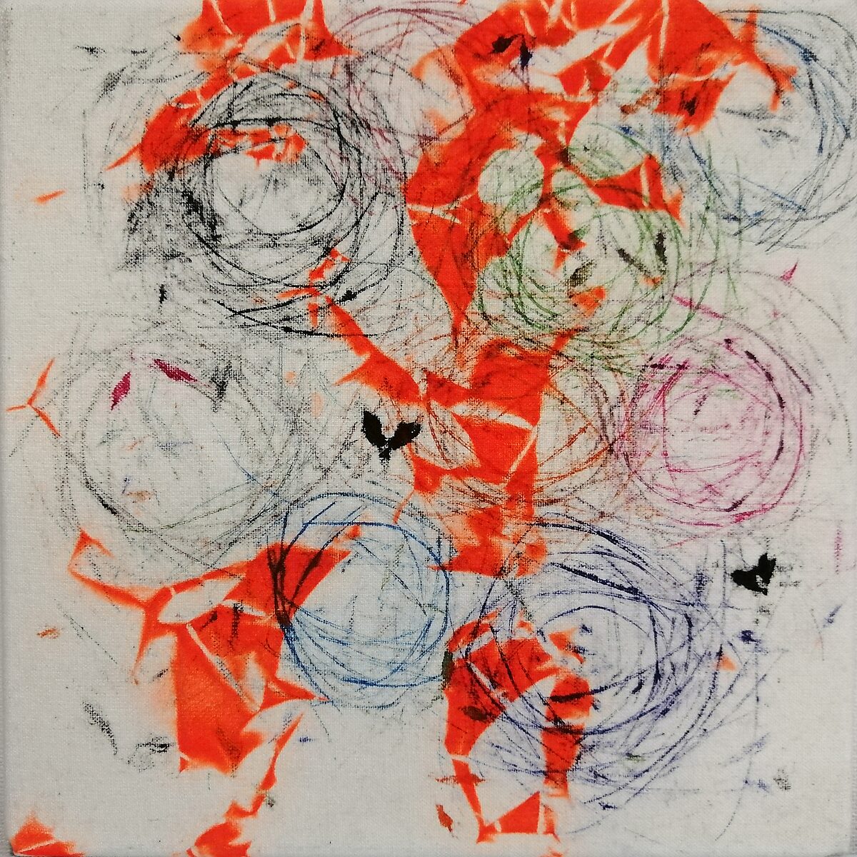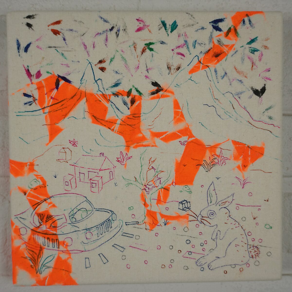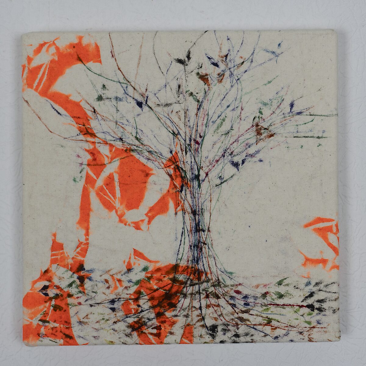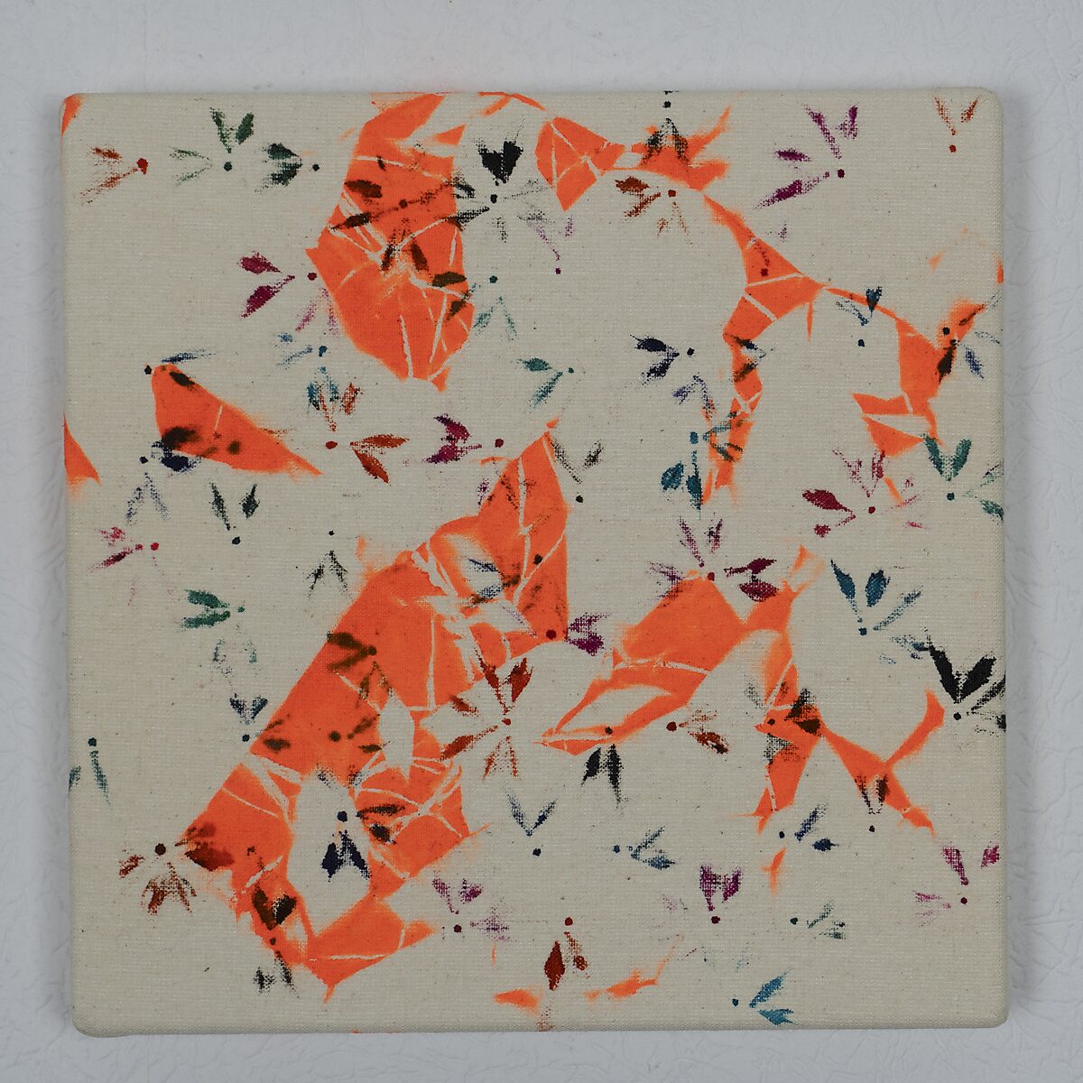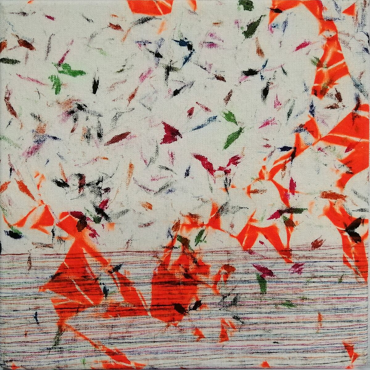 Tijdens het tekenen met gekleurde inkt en potloden gebruikt de kunstenaar kleine katoenen doekjes om restjes inkt op af te vegen. Wanneer zo’n doekje verzadigd raakt met sporen van lijnen en kleuren, rolt hij het op tot een bundeltje dat hij met koord vastbindt. Daarna spuit hij het geheel in met fluorescerend oranje verf. Zodra de verf droog is, maakt hij het doekje opnieuw los en spant het op in een kader. Zo wordt een eenvoudig hulpmiddel uit het tekenproces een autonoom kunstwerk.