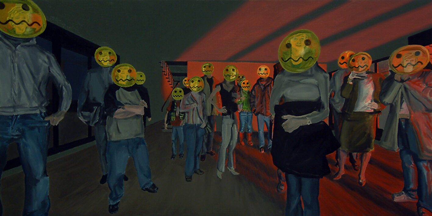 In the 3D animation, the viewer looks as though through a peephole. The camera moves from one room to another, accompanied by an ominous soundscape by Norman Hoffman. Scary smileys float through the image — ironic symbols of a virtual culture that masks fear with cheerfulness. The result is a claustrophobic dream world in which technology and fear go hand in hand.