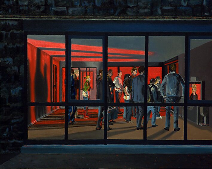 This series takes place within a closed environment. People find themselves inside a hermetic interior, while a red glow seeps in from outside.
