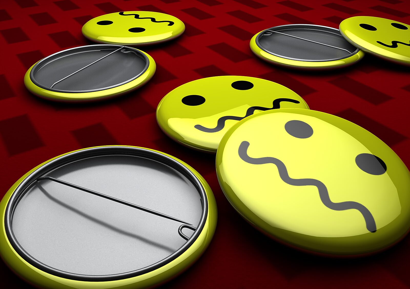 At the entrance, scary smiley pins were laid out — the same symbols that floated through the virtual scenes. Visitors were invited to pin one onto themselves: a playful yet ambiguous gesture, since the smile carried within it the threat of conformity. Outside the room, three camera viewpoints — echoes of the perspectives used in the paintings — were displayed on flatscreens. In this way, the viewer became both participant and observer of their own presence within the “cave space.”