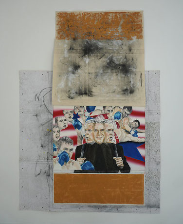 Het schilderij werd vastgenaaid aan het abstracte doek en vormt nu een openklapbaar beeld waarin de prediker meer of minder zichtbaar wordt.